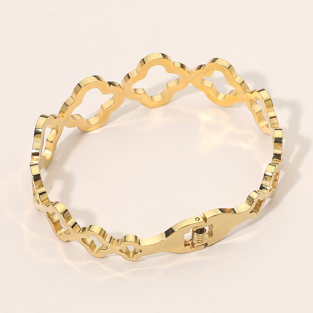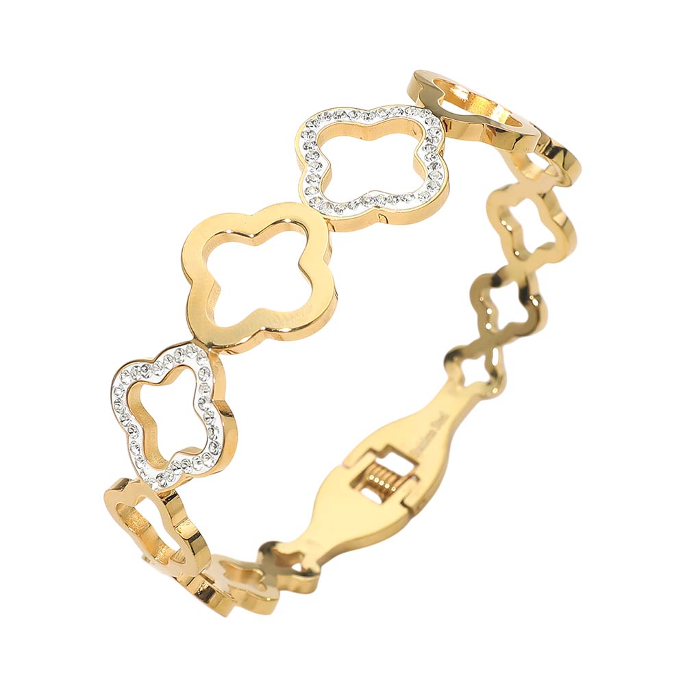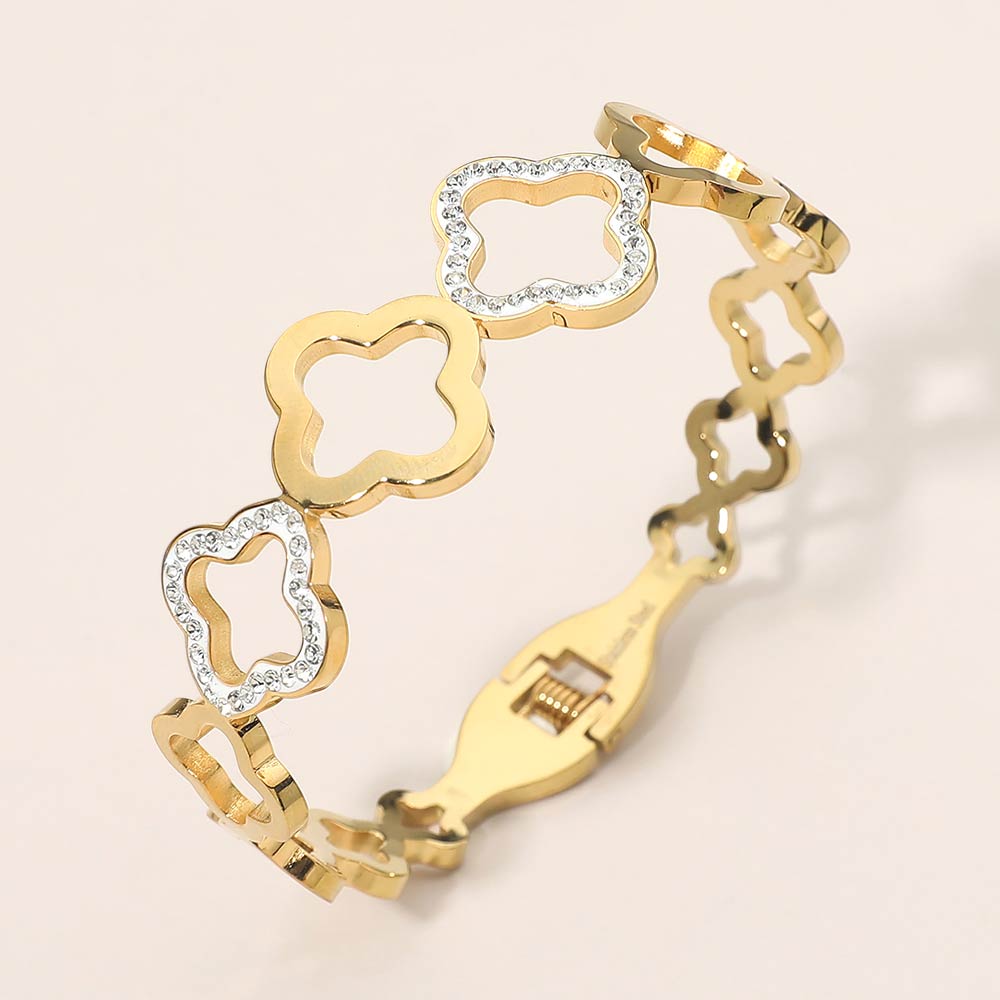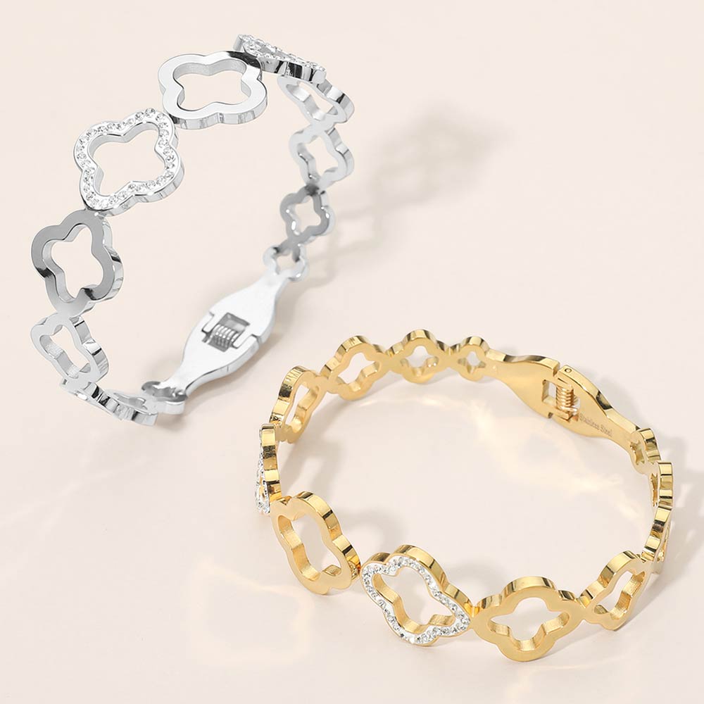 Details • Size : 0.75" H, 2.3" D • Hinged Closure • Elegant hinged bracelet featuring linked quatrefoil-inspired shapes accented with shimmering cz details. Designed for effortless wear and versatile styling, this bracelet adds refined charm to everyday looks or special occasions and pairs beautifully with other bracelets or stands out worn alone. • CZ Cubic Zirconia • Stainless Steel