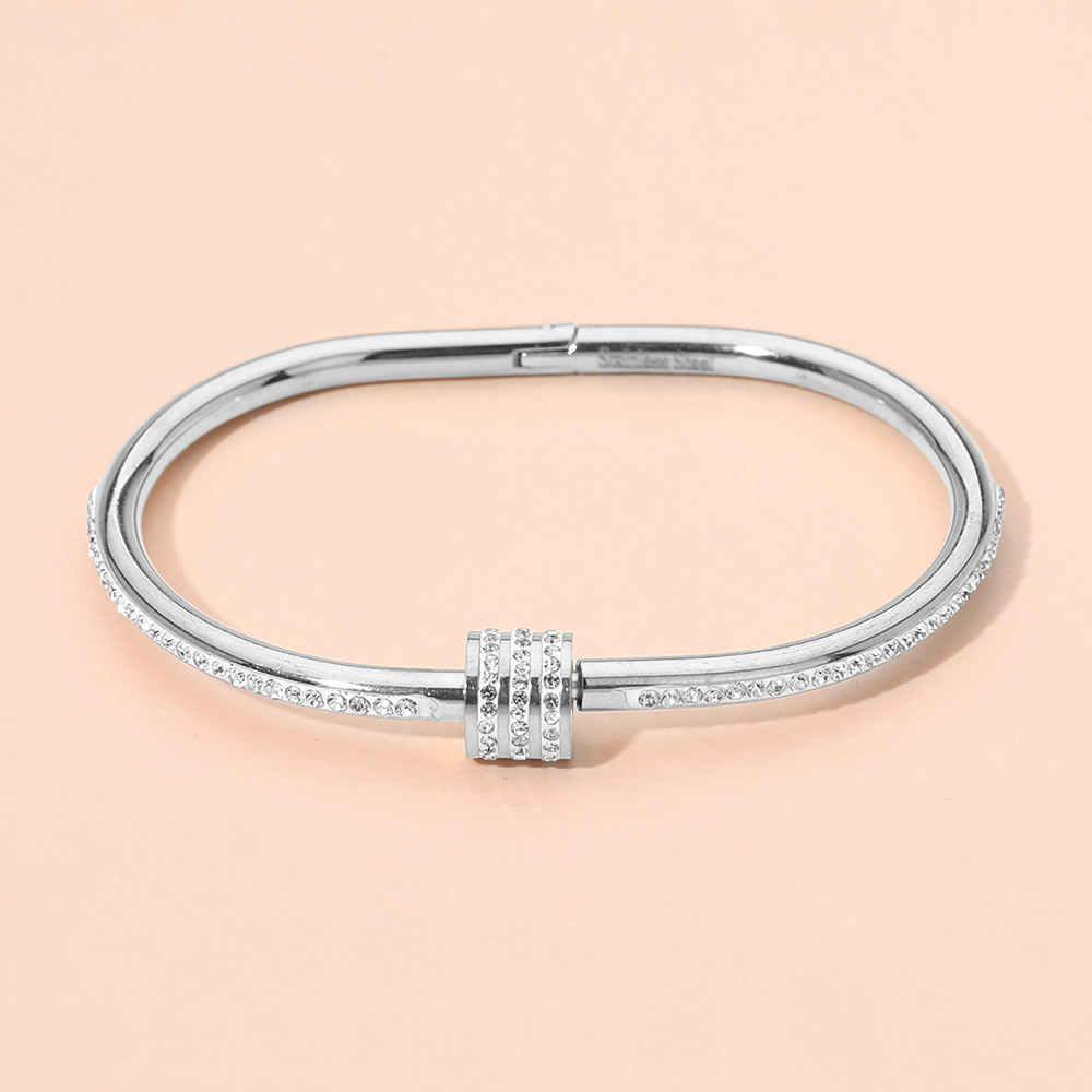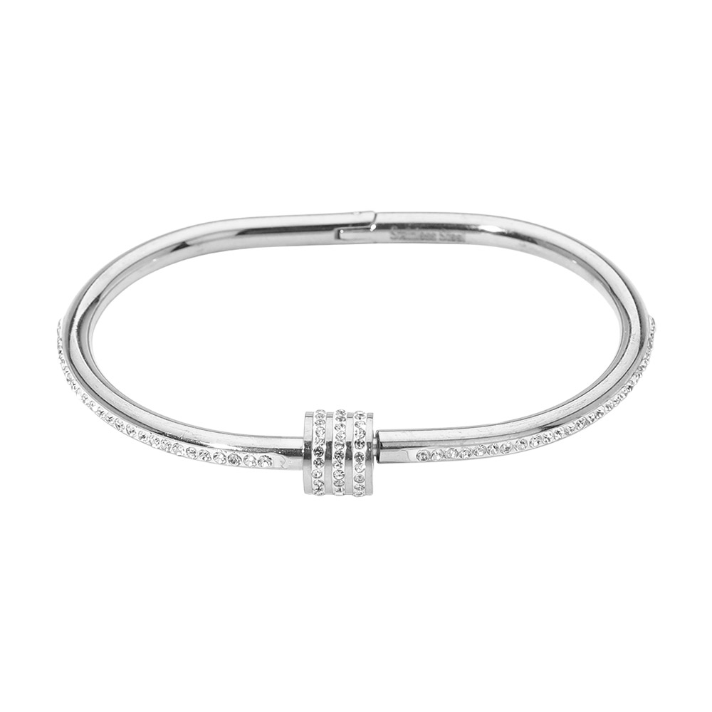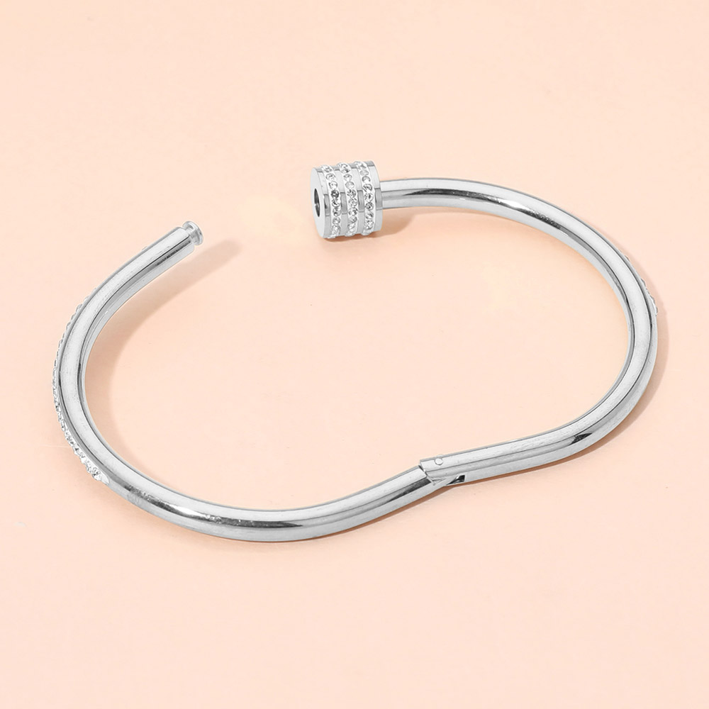 Details • Size : 0.4" H, 2.4" D • Hinged Closure • Modern open hinged bracelet featuring a sleek silhouette and refined crystal detailing for subtle sparkle. Designed to layer effortlessly or wear solo, this versatile bracelet complements casual and elevated looks, making it a timeless choice for curated jewelry collections and gift-ready displays. • CZ Cubic Zirconia • Stainless Steel