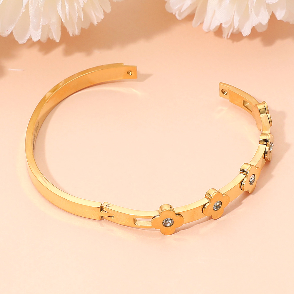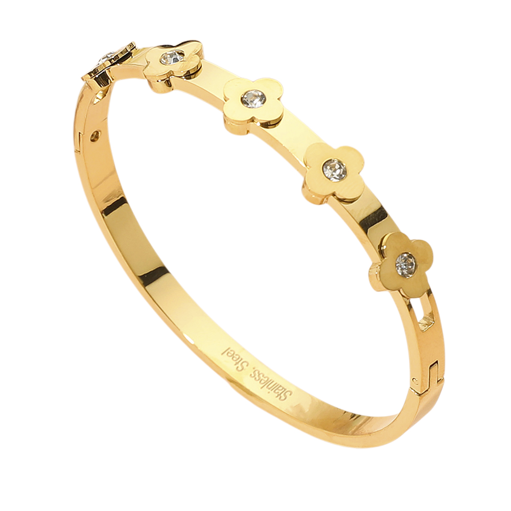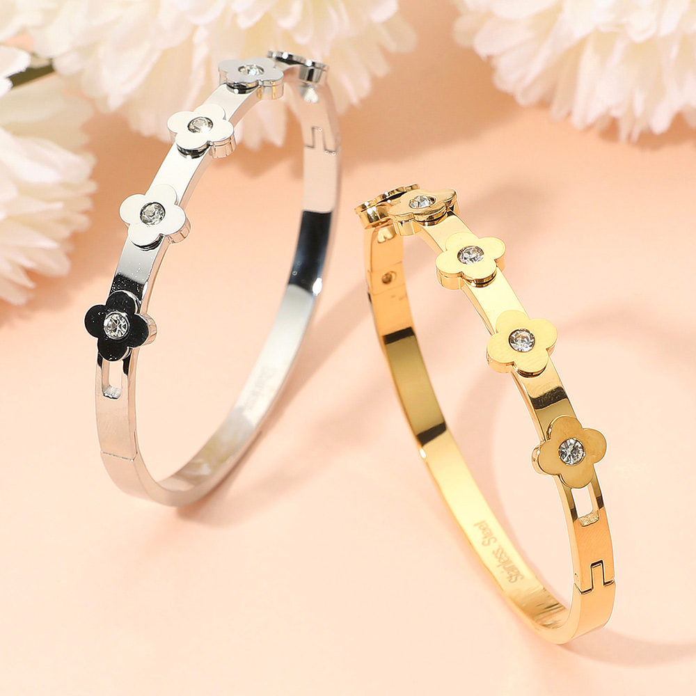 Details • Size : 0.3" H, 2.3" D • Hinged Closure • Elegant bangle bracelet featuring quatrefoil motifs adorned with sparkling crystal details. Designed for timeless style, this bracelet brings sophistication to both everyday looks and special occasions. A versatile accessory that enhances any jewelry collection. • CZ Cubic Zirconia • Stainless Steel