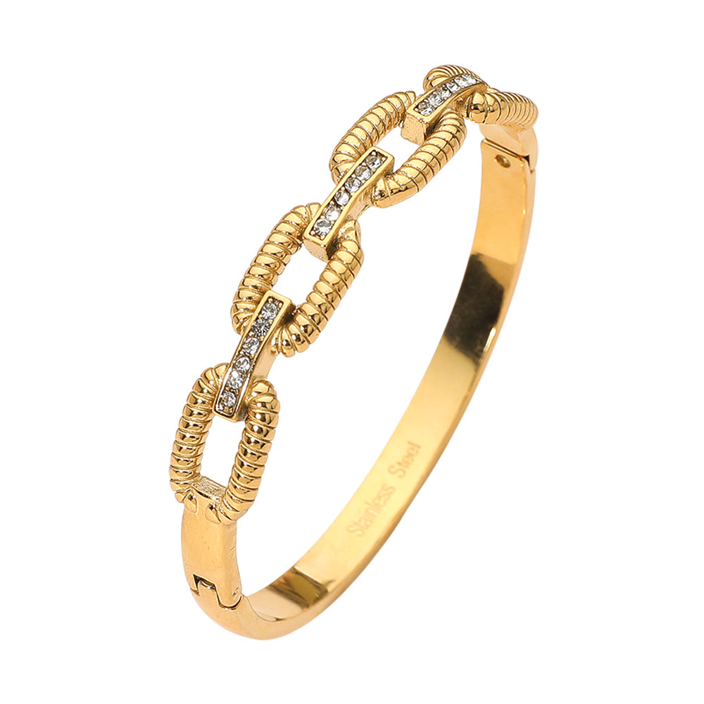 Details • Size : 0.4" H, 2.3" D • Hinged Closure • Statement bangle designed with bold interlocking link details and subtle accent sparkle for a sophisticated, modern finish. Easy to wear and comfortable for daily styling, perfect for stacking or as a standout solo piece to elevate casual and dress outfits alike. • CZ Cubic Zirconia • Stainless Steel