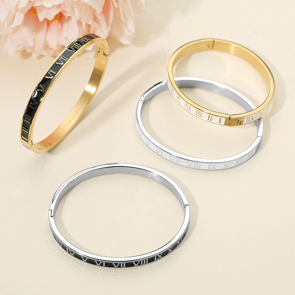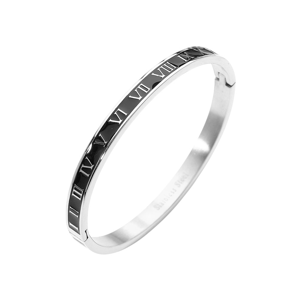 Stainless Steel Enamel Inlay Roman Numeral Hinged Bangle Bracelet
