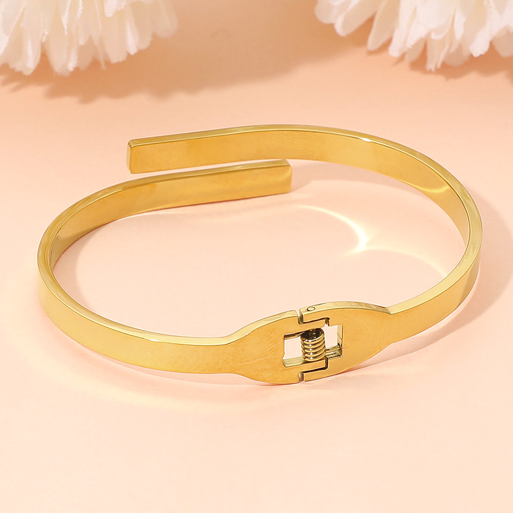 Details • Size : 0.5" H, 2.3" D • Hinged Closure • Elegant bangle bracelet featuring a sleek overlapping design enhanced with a refined inlay detail. Its minimalist yet stylish look makes it a versatile accessory, perfect for adding a touch of sophistication to everyday outfits or evening ensembles. • Stainless Steel