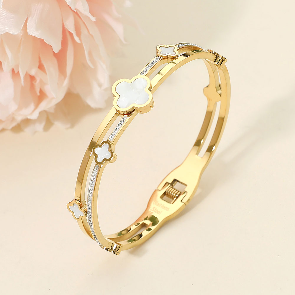 Stainless Steel Mother of Pearl Quatrefoil CZ Stone Split Hinged Bangle Bracelet Stainless Steel Mother of Pearl Quatrefoil CZ Stone Split Hinged Bangle Bracelet Stainless Steel Mother of Pearl Quatrefoil CZ Stone Split Hinged Bangle Bracelet