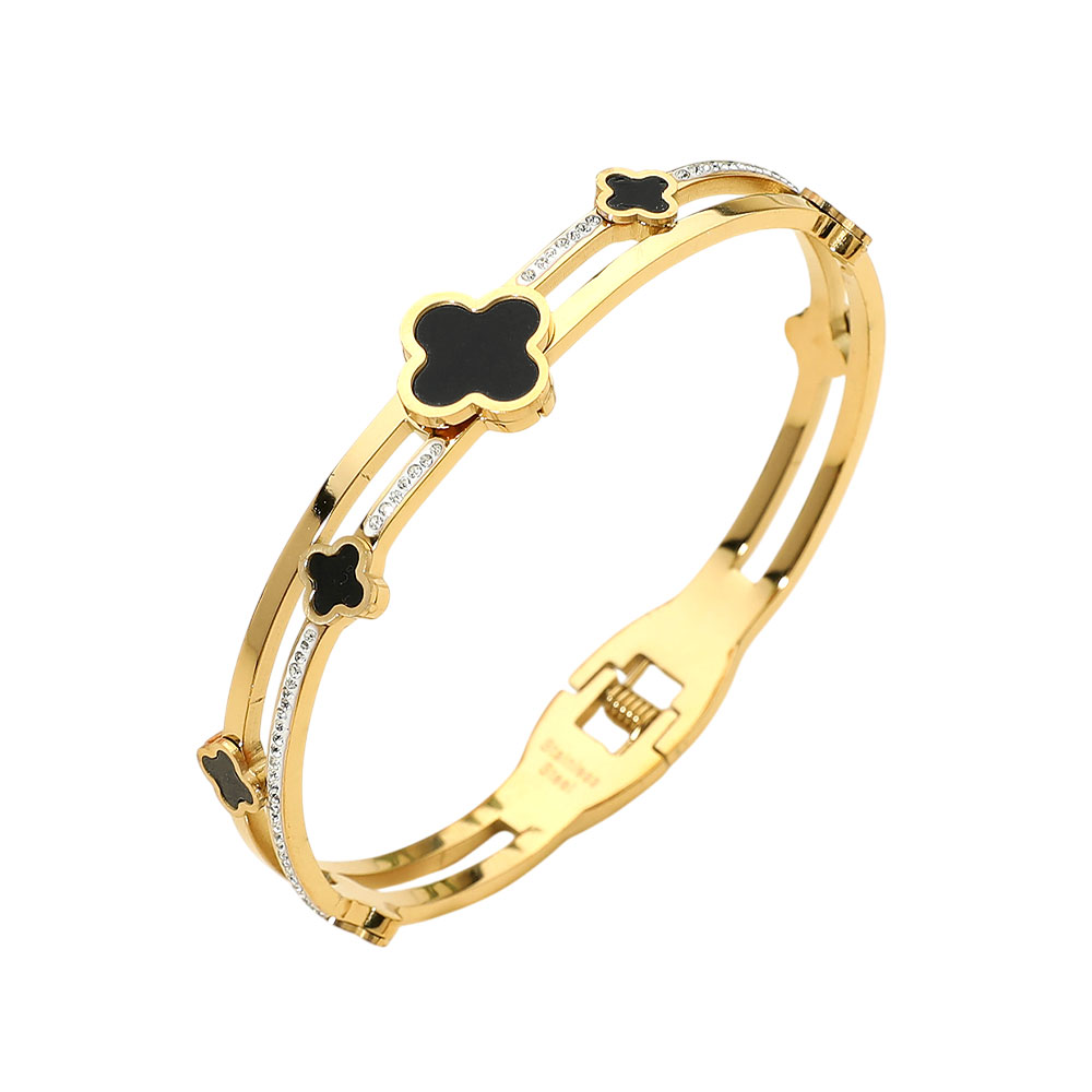 Details • Size : 0.5" H, 2.3" D • Hinged Closure • Elegant hinged bangle bracelet featuring a refined quatrefoil-inspired design with delicate accent detailing for a timeless, polished look. Designed with a secure open-and-close hinge for easy wear and comfort. Ideal for everyday styling, gifting, and boutique jewelry collections seeking classic charm with modern appeal. • CZ Cubic Zirconia • Stainless Steel