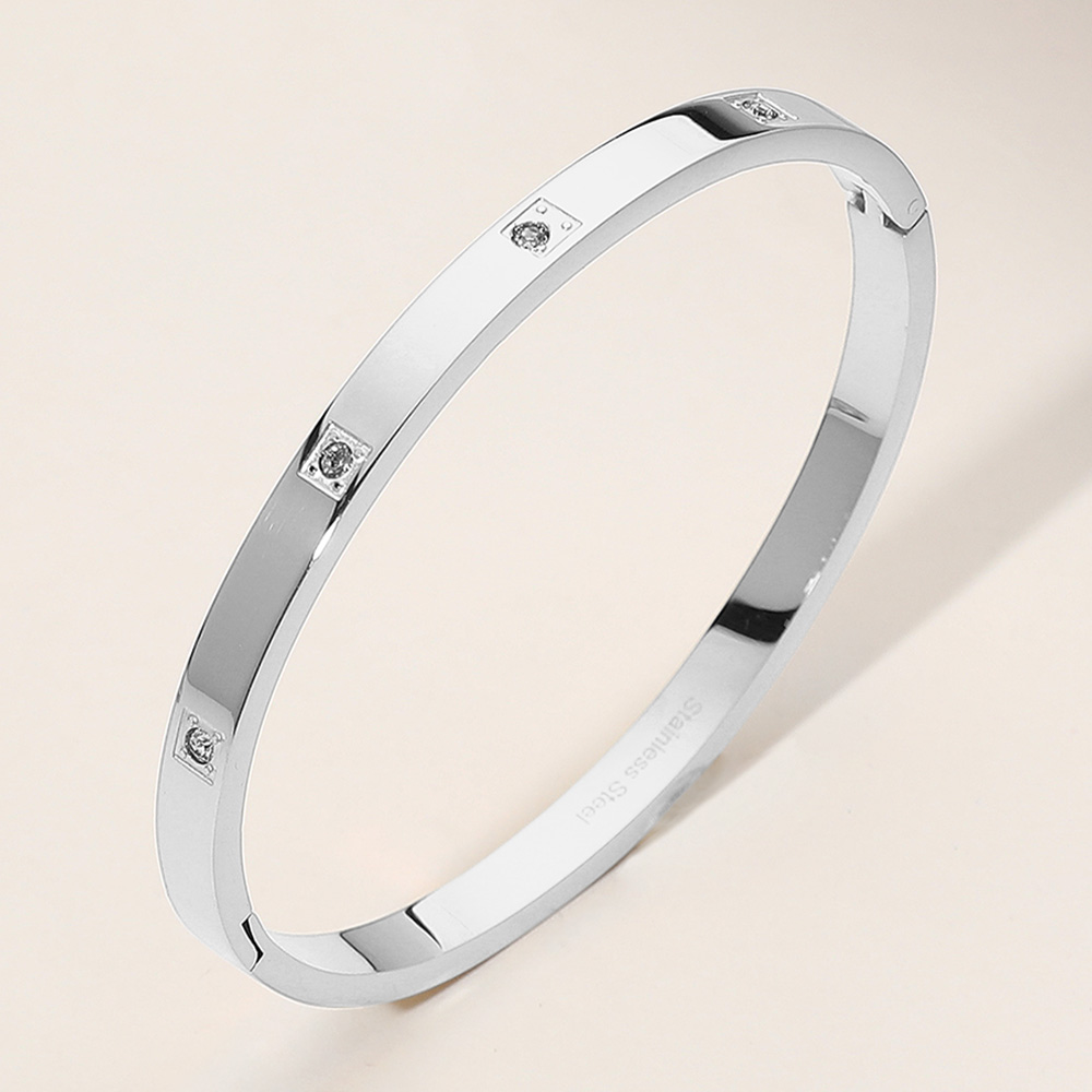 Details • Size : 0.25" H, 2.3" D • Hinged Closure • Elegant bangle bracelet featuring a polished design accented with sparkling crystals for a refined touch. Perfect for stacking or wearing alone, this versatile accessory complements both everyday outfits and formal looks with timeless sophistication. • Stainless Steel