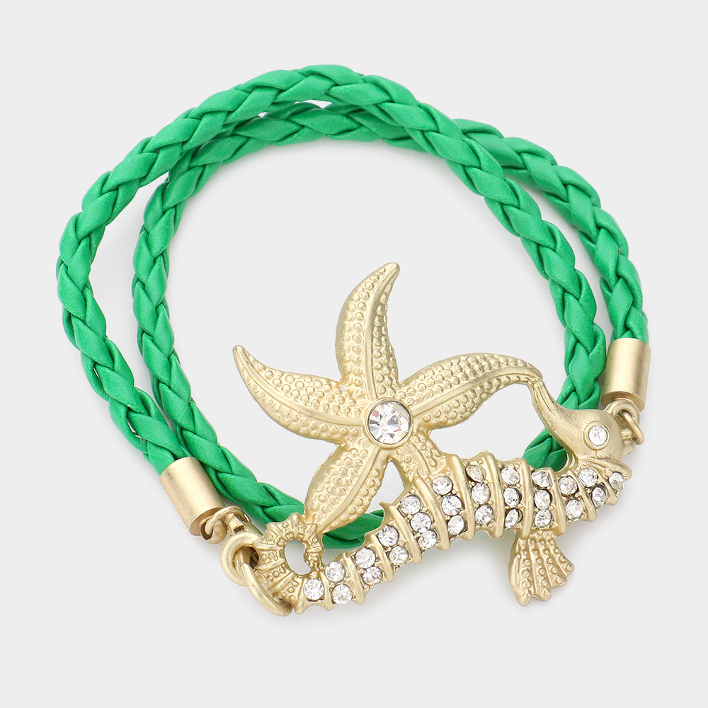 Stone Embellished Starfish Seahorse Braided Faux Leather Wrap Bracelet