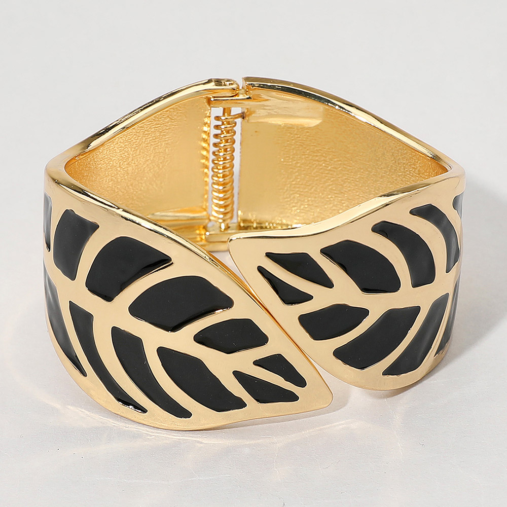 • Elegant wide cuff bracelet featuring a stylish leaf-inspired cutout design. The smooth enamel inlay and polished finish add sophistication, making it perfect for both casual and formal wear. A statement accessory that enhances any outfit with modern nature-inspired elegance.