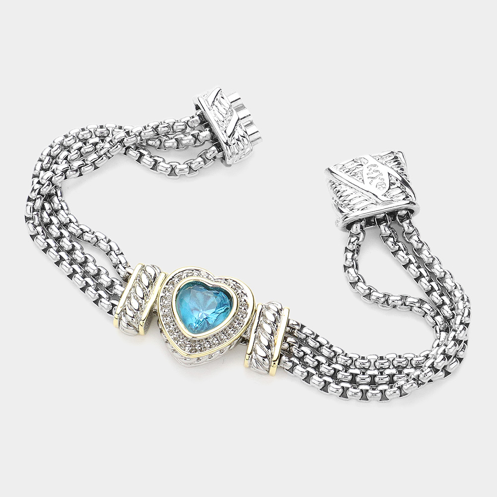 Details • Size : 0.75" H, 7" L • Magnetic Closure • Chic multi-strand bracelet with a heart-shaped centerpiece embellished with sparkling accents. Designed with a secure magnetic clasp, this elegant bracelet adds a stylish touch to everyday wear and special occasions. • Gold Dipped • CZ Cubic Zirconia