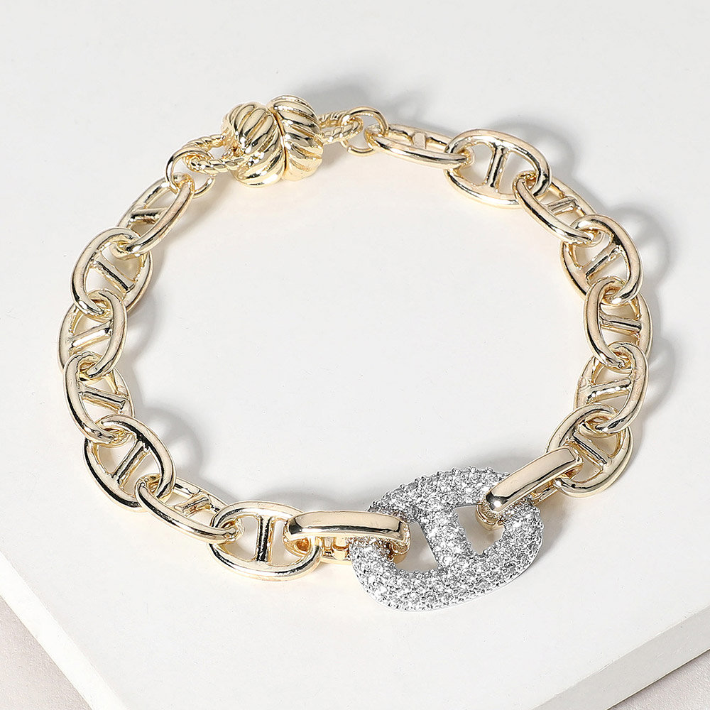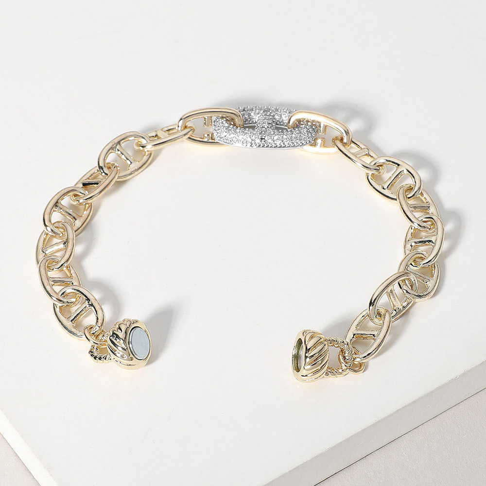 • Stylish chain link bracelet highlighted by a dazzling oval centerpiece adorned with sparkling crystals. The secure magnetic clasp ensures easy wear, blending modern elegance with timeless charm. Perfect for layering or as a statement piece to elevate casual and formal looks alike.