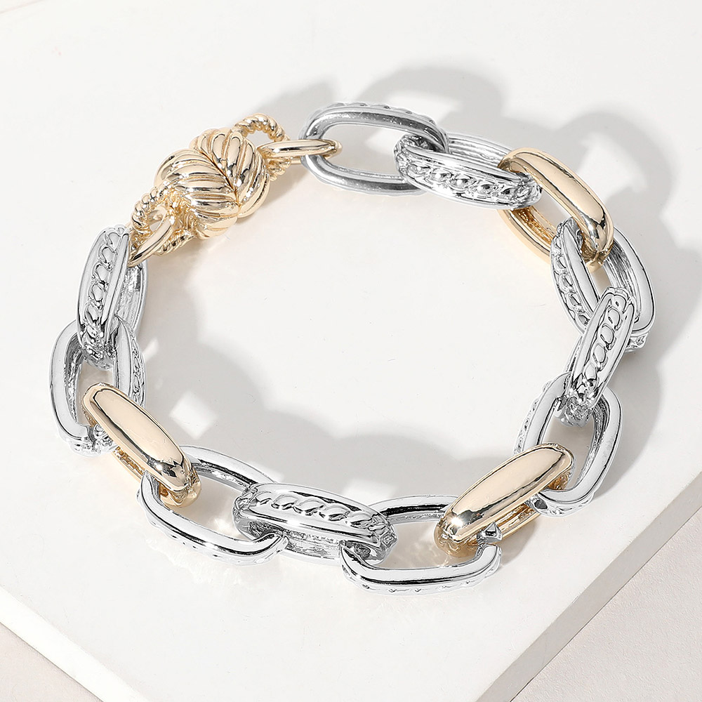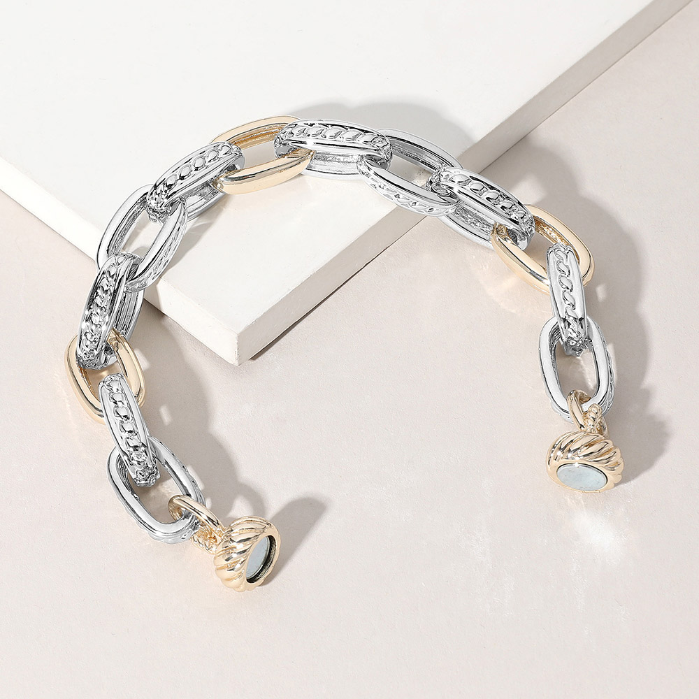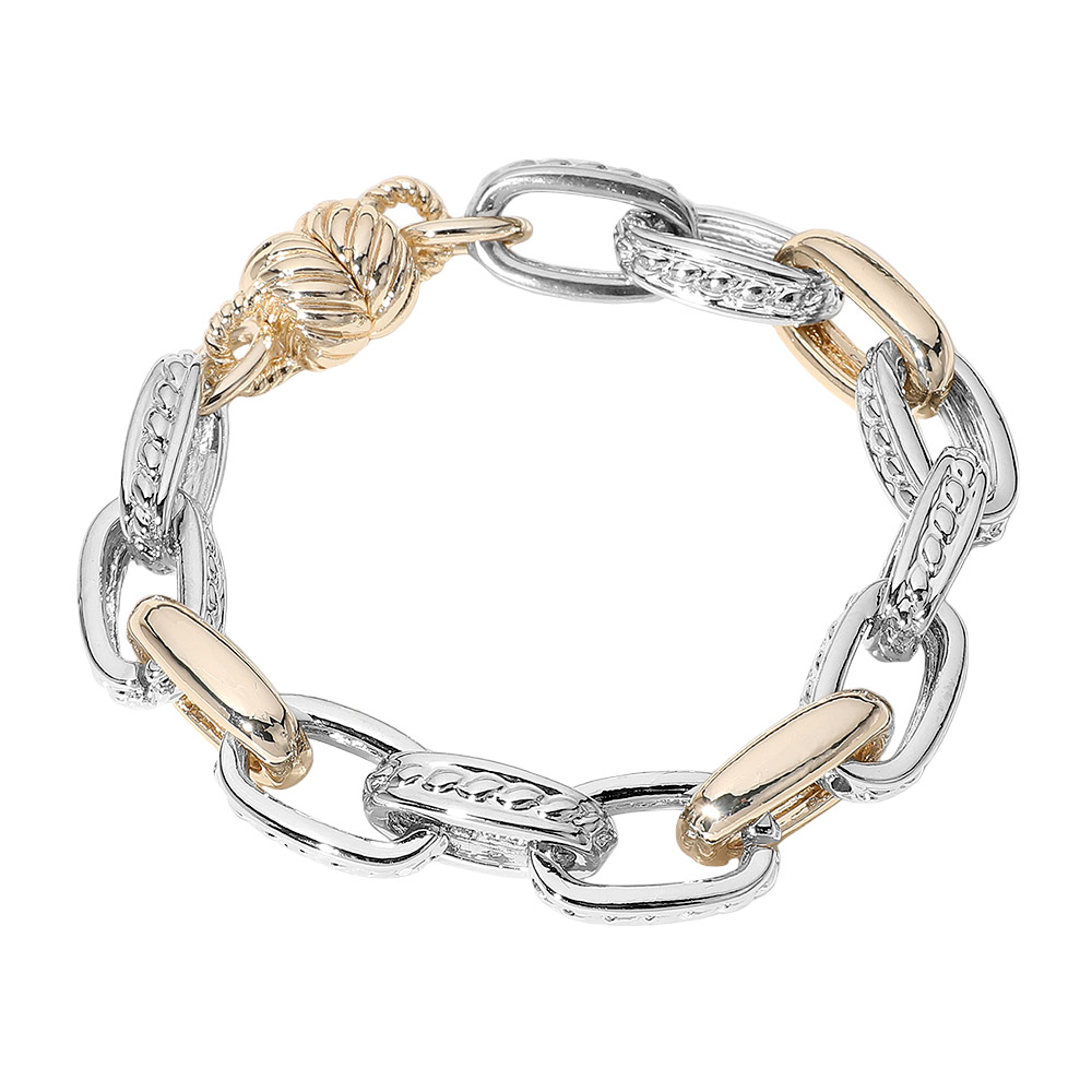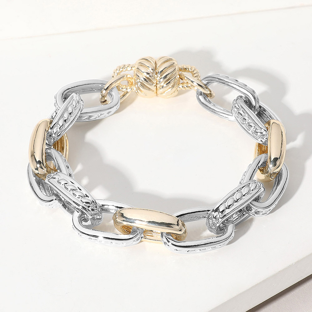 Details • Size : 0.4" H, 8.5" L • Magnetic Closure • Stylish bracelet showcasing bold, textured links in a striking two-tone design, secured with a magnetic clasp for ease and elegance. A versatile statement accessory that complements both modern and classic looks effortlessly. • Gold Dipped