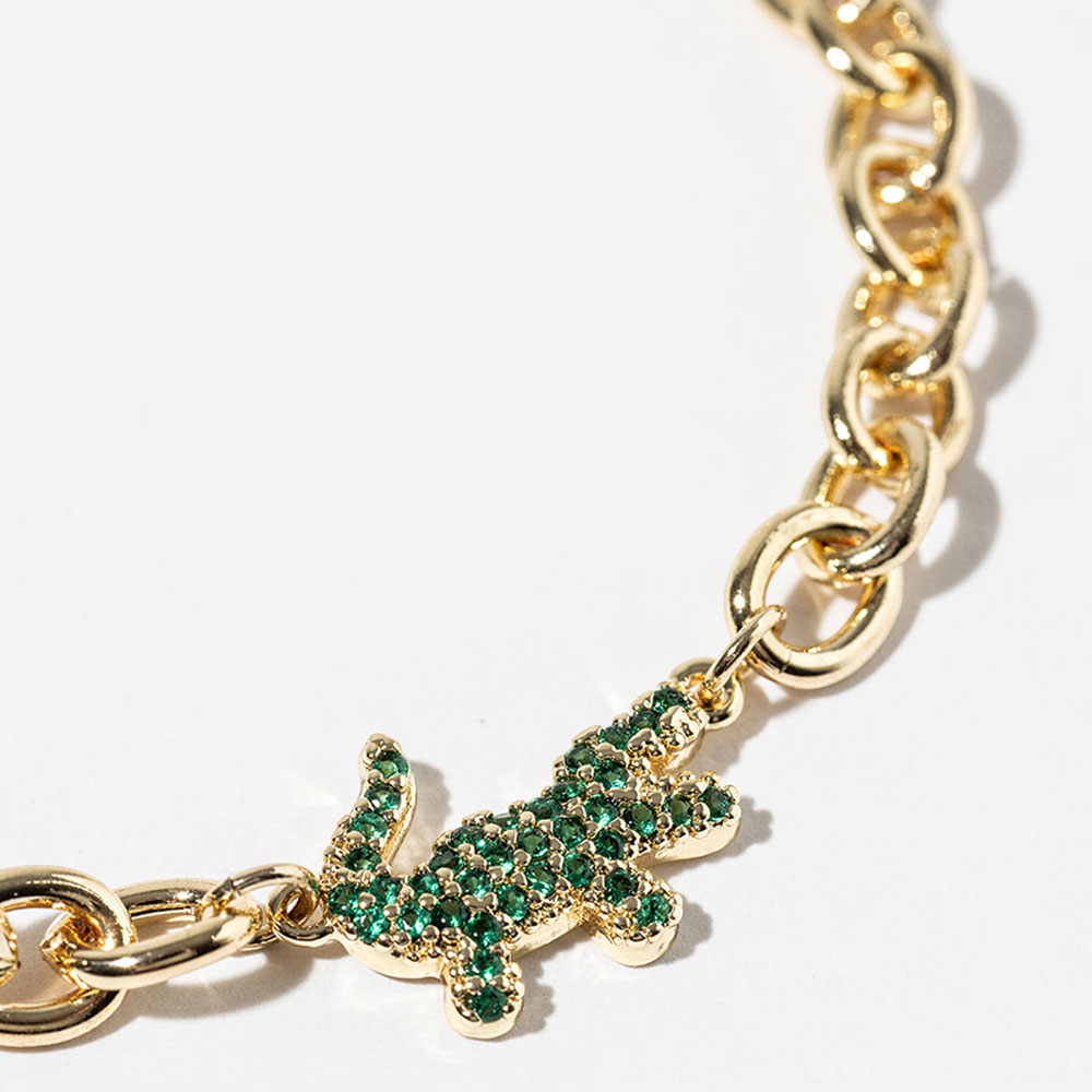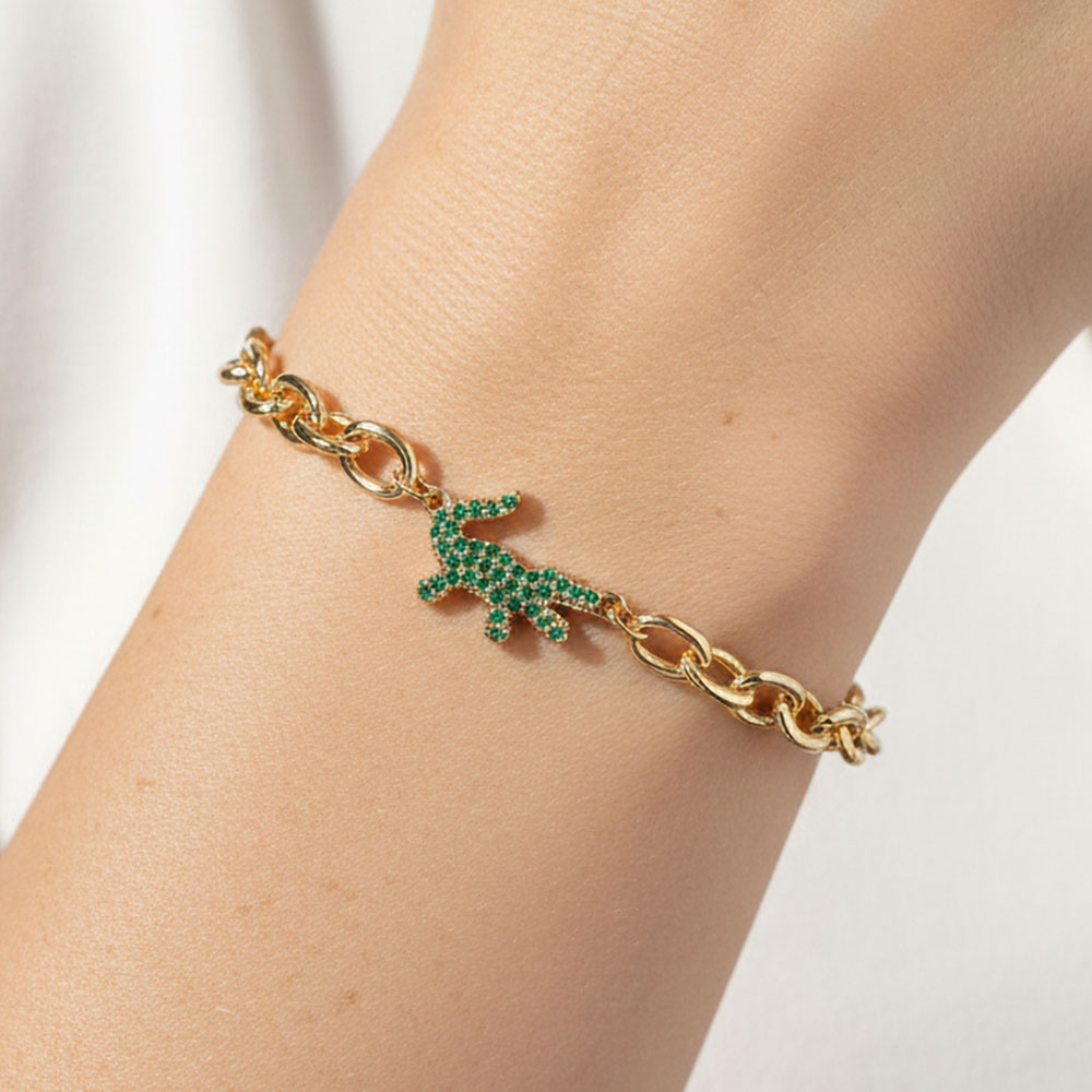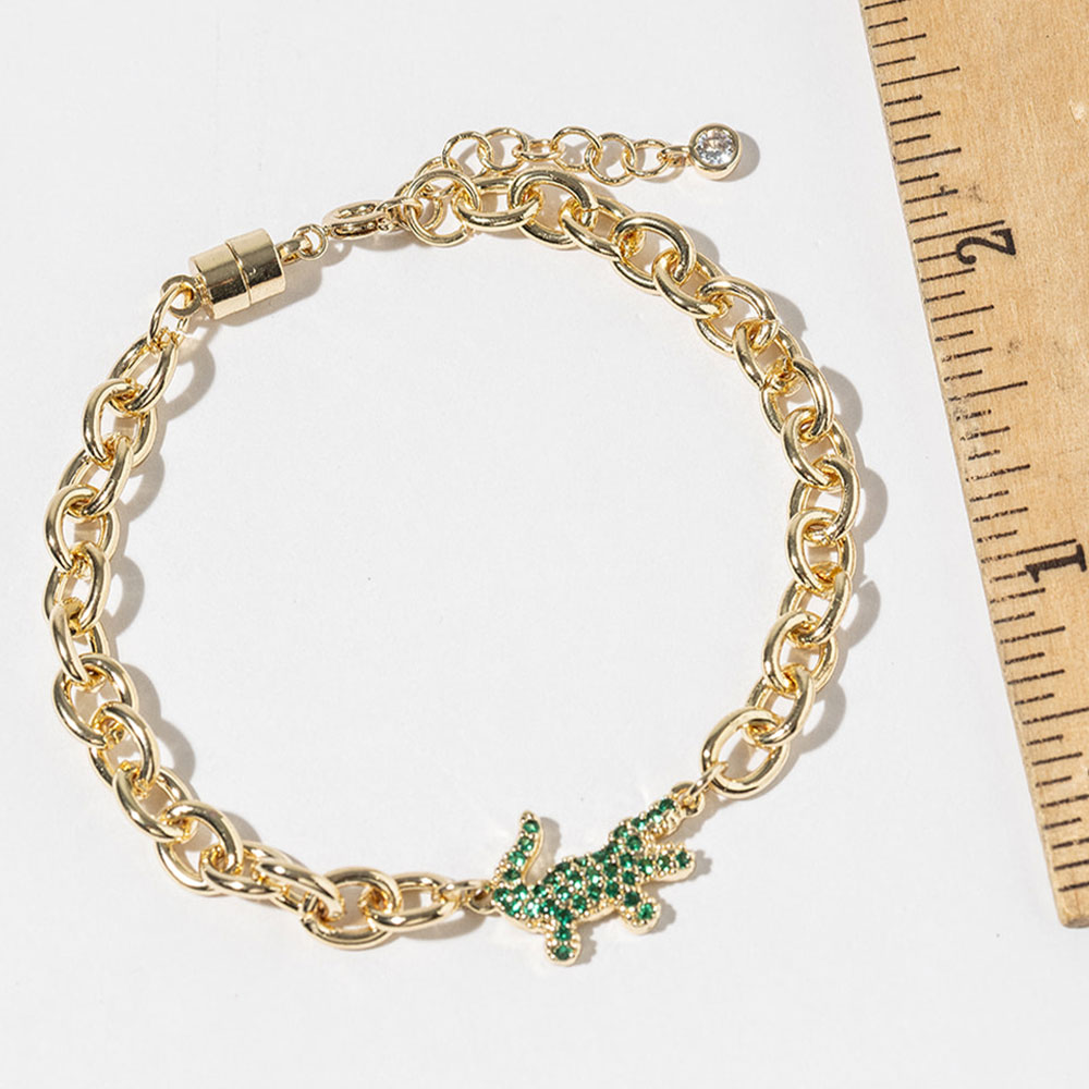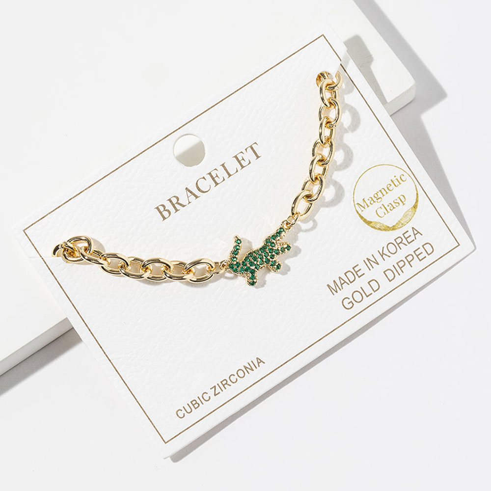 Details • Size : 0.5" H, 6.5" + 0.5" L • Magnetic Clasp Closure • This alligator charm chain bracelet features a bold animal inspired accent paired with a convenient magnetic clasp for easy wear. Designed to stand out while remaining versatile, it works well for everyday styling or statement layering. A strong addition to boutique assortments, themed collections, and gift focused displays that attract customers looking for playful yet stylish accessories. • Lead and Nickel Compliant • Made In Korea • Gold Dipped • CZ Cubic Zirconia