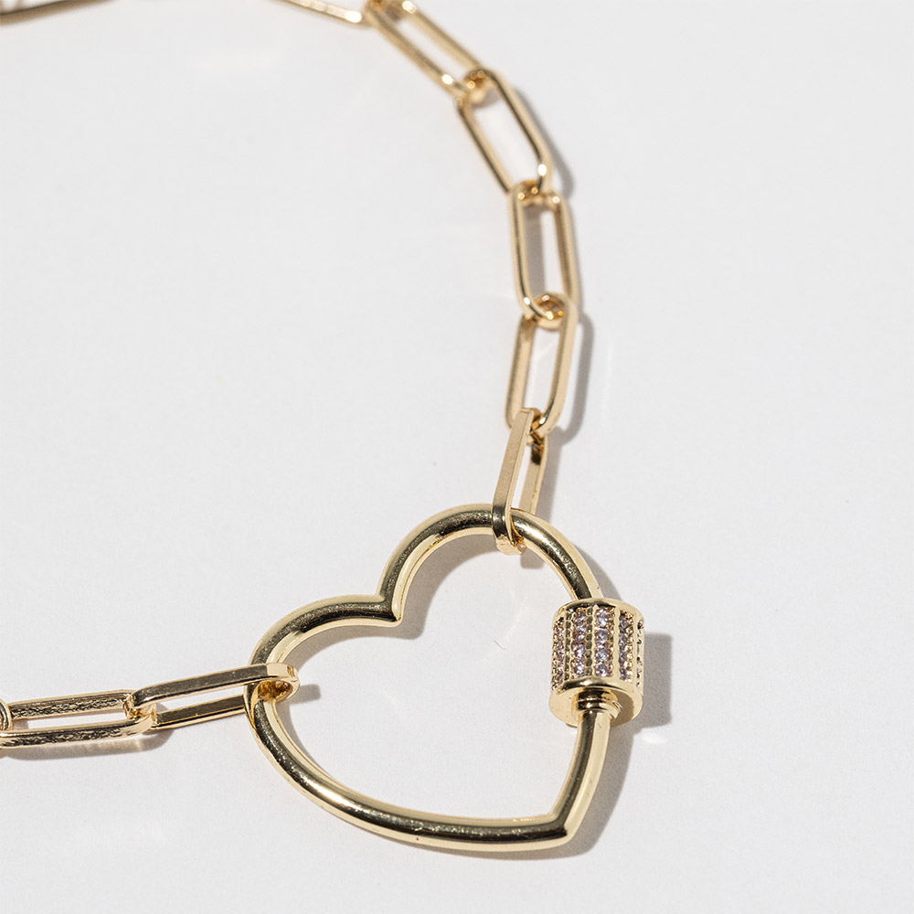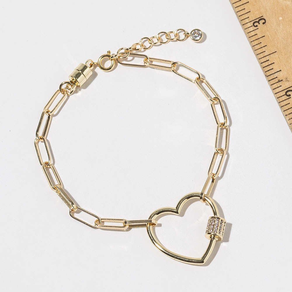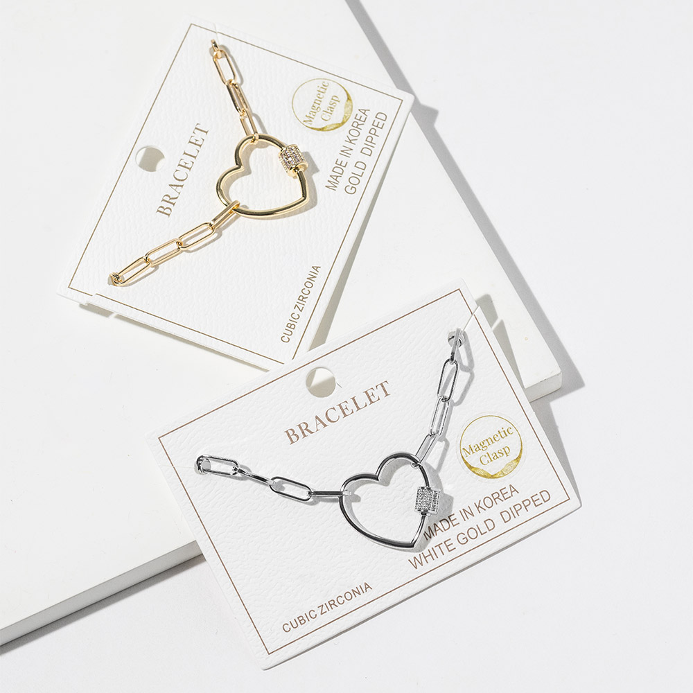 Details • Size : 0.8" H, 7" + 1" L • Magnetic Clasp Closure • Elevate your everyday look with this stylish heart carabiner link charm bracelet featuring a sleek magnetic closure for easy wear. Designed with a modern, minimal shape that adds a romantic accent, it complements both casual and dressy outfits. A chic accessory that brings charm to any wrist. • CZ Cubic Zirconia • Gold Dipped • Lead and Nickel Compliant • Made In Korea