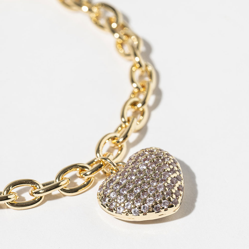 • Heart charm chain bracelet featuring a polished link design with a pavĂ©-style heart accent and easy clasp closure. This elegant bracelet adds a romantic, eye-catching touch to everyday styling and special occasions, making it ideal for gifting, layering, or boutique jewelry collections seeking a timeless yet modern statement piece.