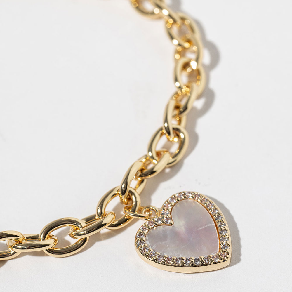 White Gold Dipped CZ Stone Rim Mother of Pearl Heart Charm Magnetic Chain Bracelet