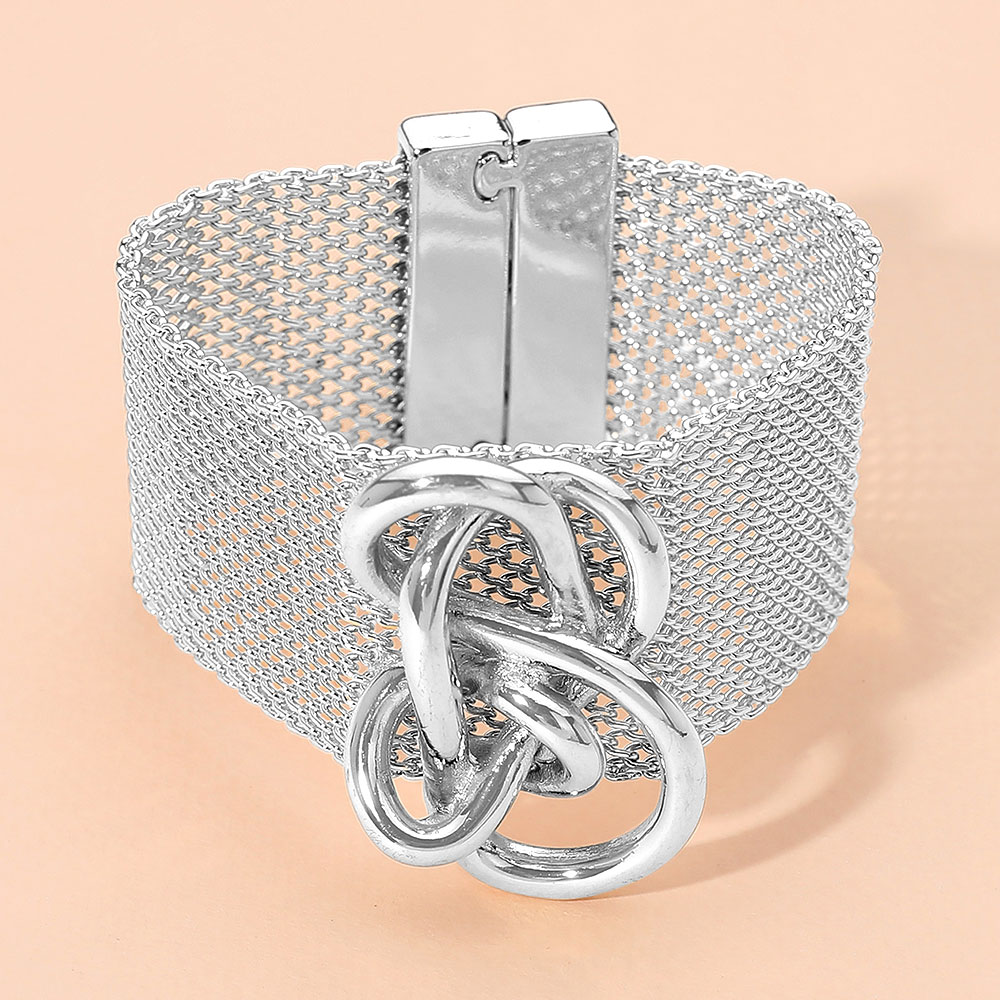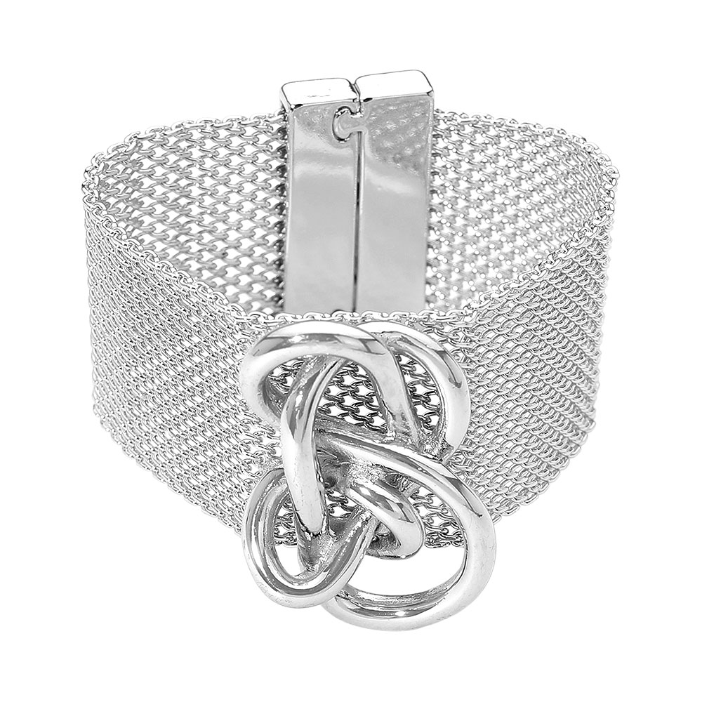 • Make a bold impression with this mesh knot statement bracelet featuring a wide mesh band and an intricate interlocking knot centerpiece. Designed with a secure clasp and artistic flair, it’s a standout accessory that brings modern edge and elegance to any outfit.