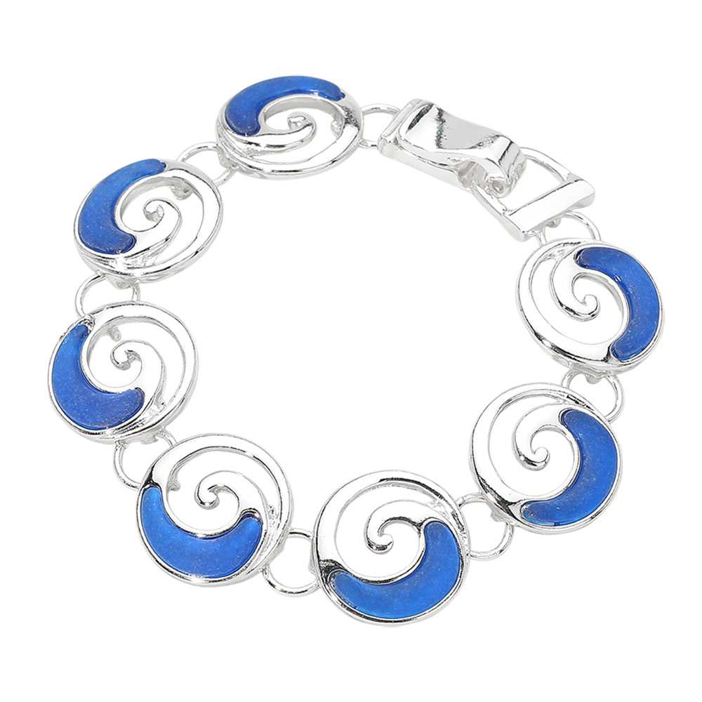 Details • Size : 0.75" H, 7" + 0.5" L • Magnetic Closure • Elegant swirl link bracelet designed with flowing wave-inspired shapes and a secure magnetic closure for effortless wear. A versatile accessory that complements casual and resort looks, making it ideal for beach themes, gift shops, and seasonal jewelry collections. • Lead and Nickel Compliant