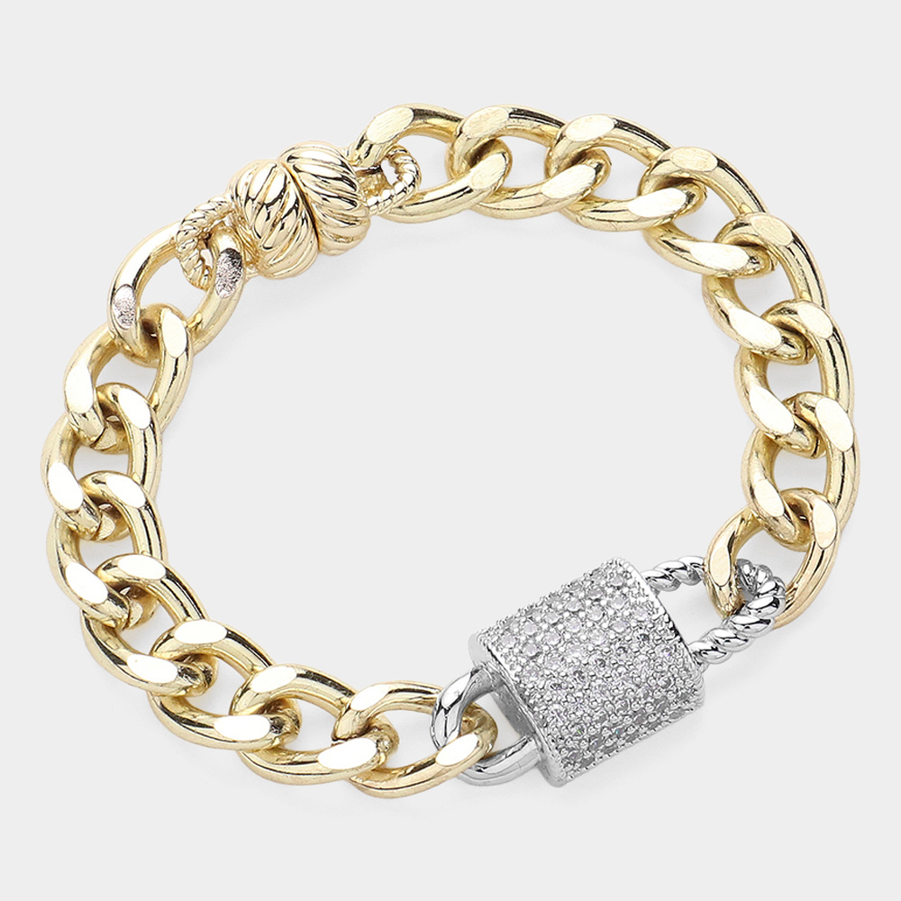 Two Tone CZ Stone Paved Lock Pointed Magnetic Bracelet