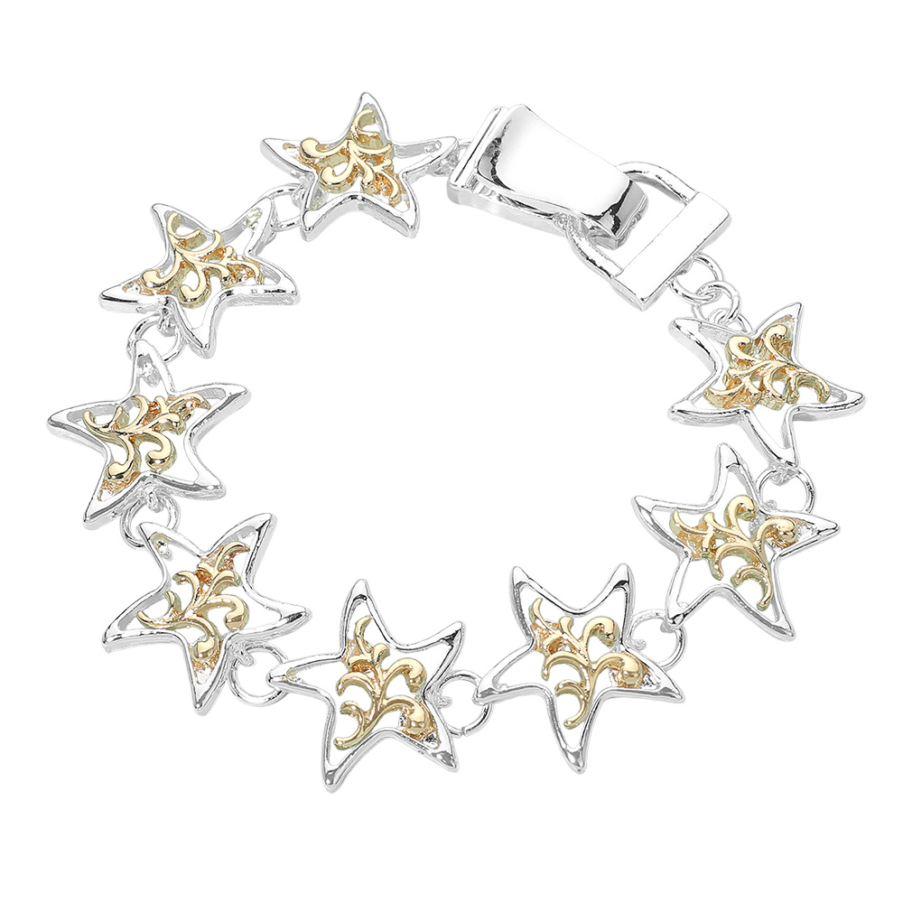 Details • Size : 0.75" H, 7.5" + 0.75" L • Magnetic Closure • This starfish charm bracelet showcases linked starfish accents that create a playful, ocean-inspired look. Designed for everyday styling or gifting, it adds movement and personality to any accessory assortment and fits perfectly into beach, summer, and coastal-themed jewelry collections. • Lead and Nickel Compliant