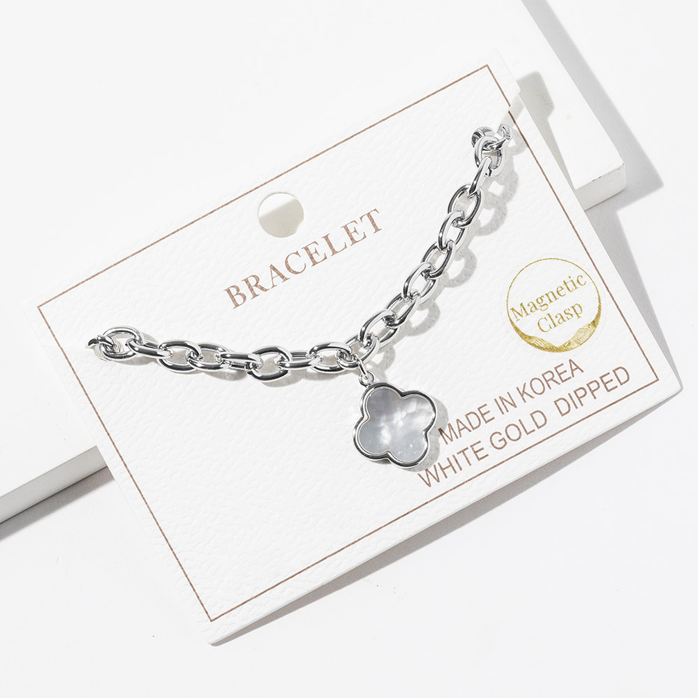 White Gold Dipped Mother of Pearl Quatrefoil Charm Accent Chain Link Magnetic Bracelet