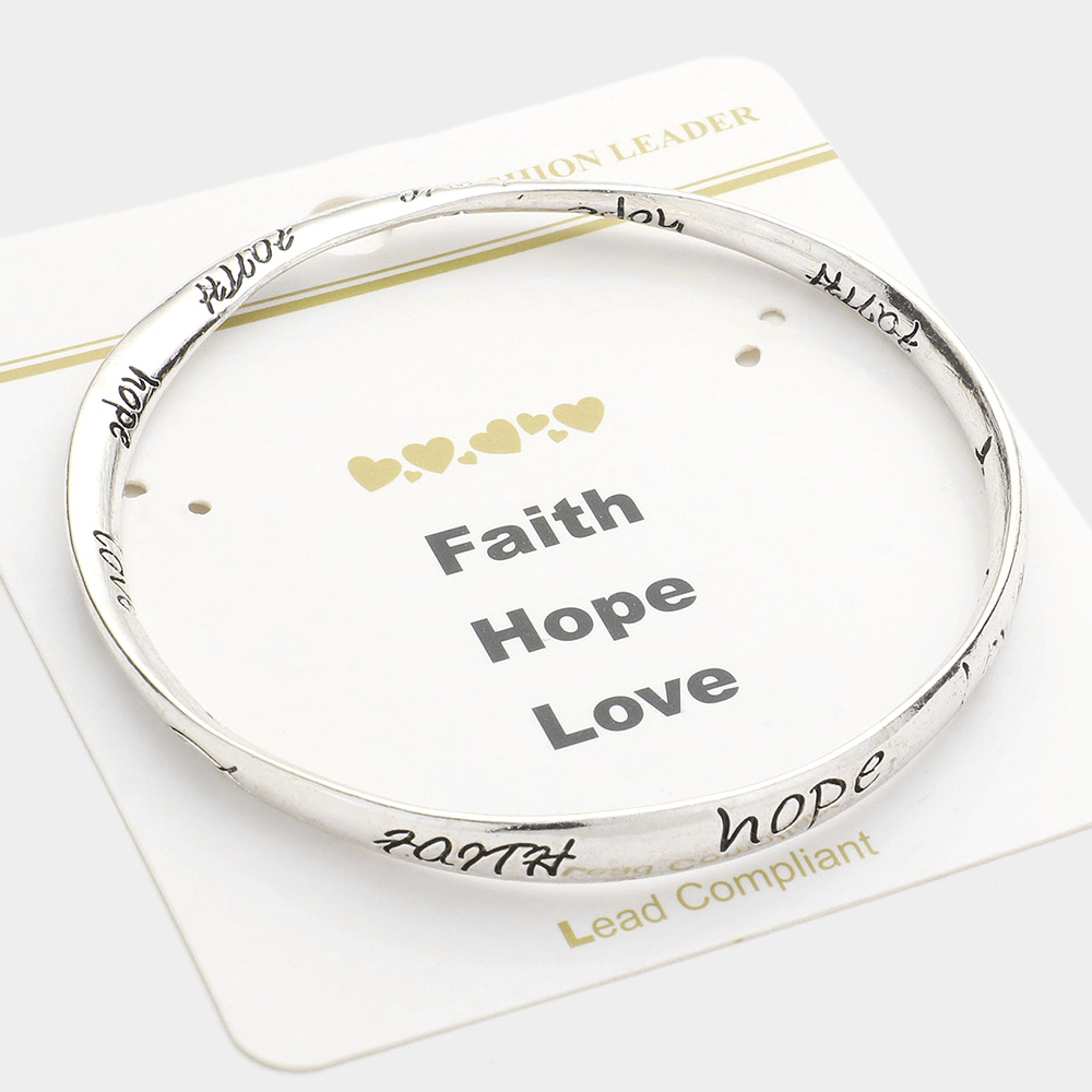 Details • Size : 0.25" H, 2.6" D • This inspirational bangle bracelet features uplifting engraved words that highlight the enduring values of faith, hope, and love. Designed as a meaningful reminder for everyday encouragement, it makes a thoughtful accessory or heartfelt gift for someone special seeking positivity. • Lead and Nickel Compliant