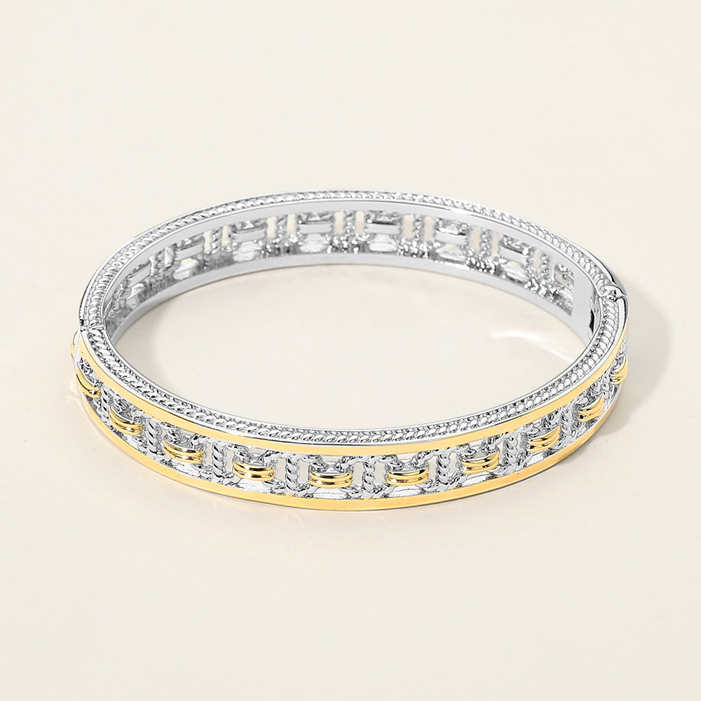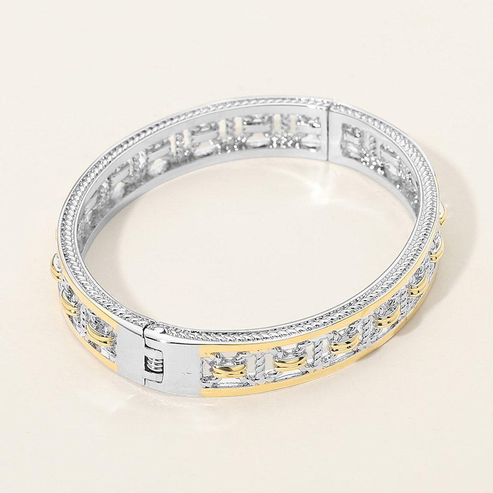 Details • Size : 0.3" H, 2.4" D • Hinged Closure • Elegant hinged bangle bracelet designed with textures and repeating chain-style accents for a refined, dimensional look. Structured silhouette offers a secure and comfortable fit, perfect for everyday wear or stacking. A versatile jewelry piece ideal for boutiques seeking timeless yet modern statement accessories. • Gold Dipped