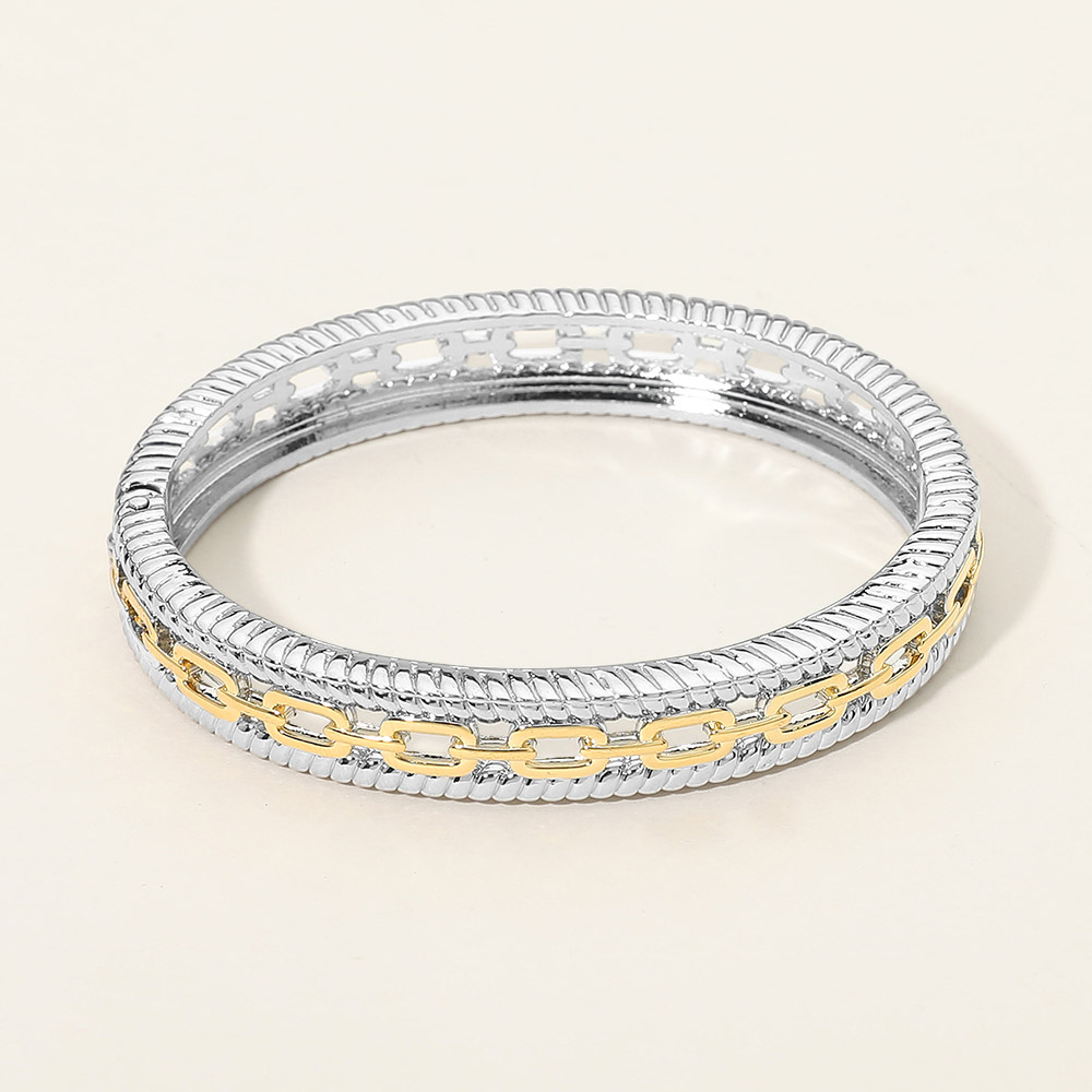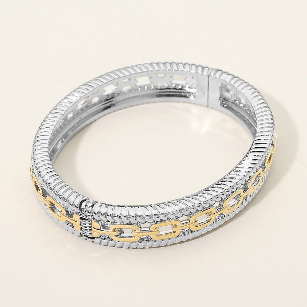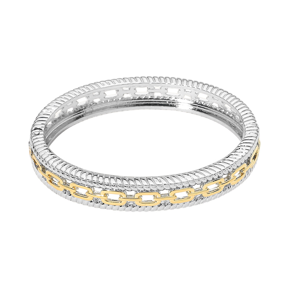 Details • Size : 0.4" H, 2.5" D • Hinged Closure • Refined hinged bangle bracelet designed with layered textures and a sleek chain-inspired accent for a modern, elevated look. Structured silhouette offers a secure and comfortable fit, perfect for everyday wear or stacking with other styles. A versatile jewelry piece ideal for boutiques seeking polished, contemporary accessories. • Gold Dipped