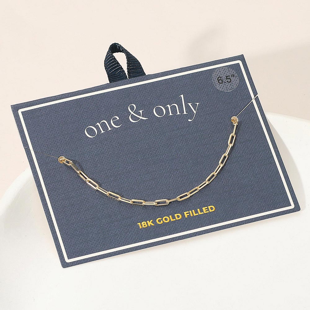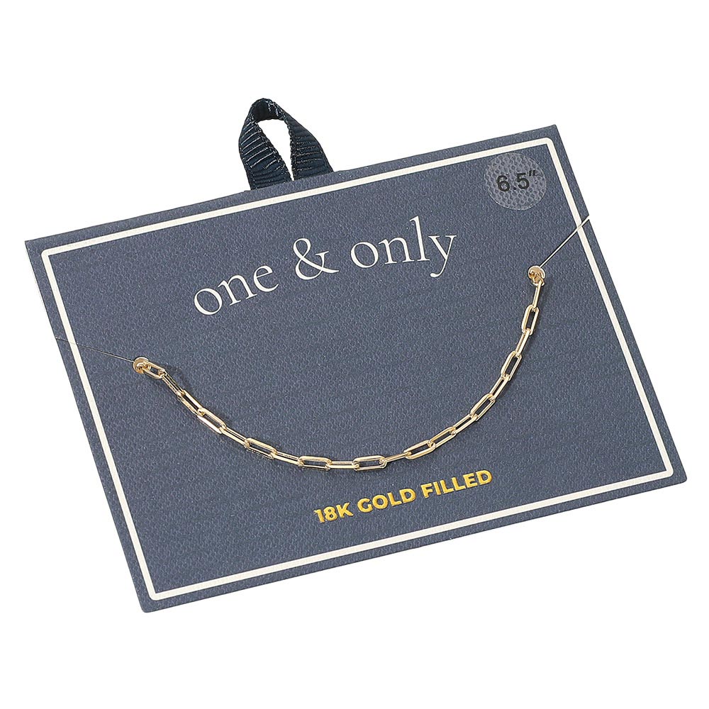 Details • Size : 0.1" H (2mm), 6.5" L • Elegant chain bracelet featuring a minimalist link design for timeless sophistication. Lightweight and versatile, it’s perfect for layering or wearing alone. Presented on a “one & only” card for effortless gifting and everyday elegance. • Gold Filled • Lead and Nickel Compliant • Made In Brazil