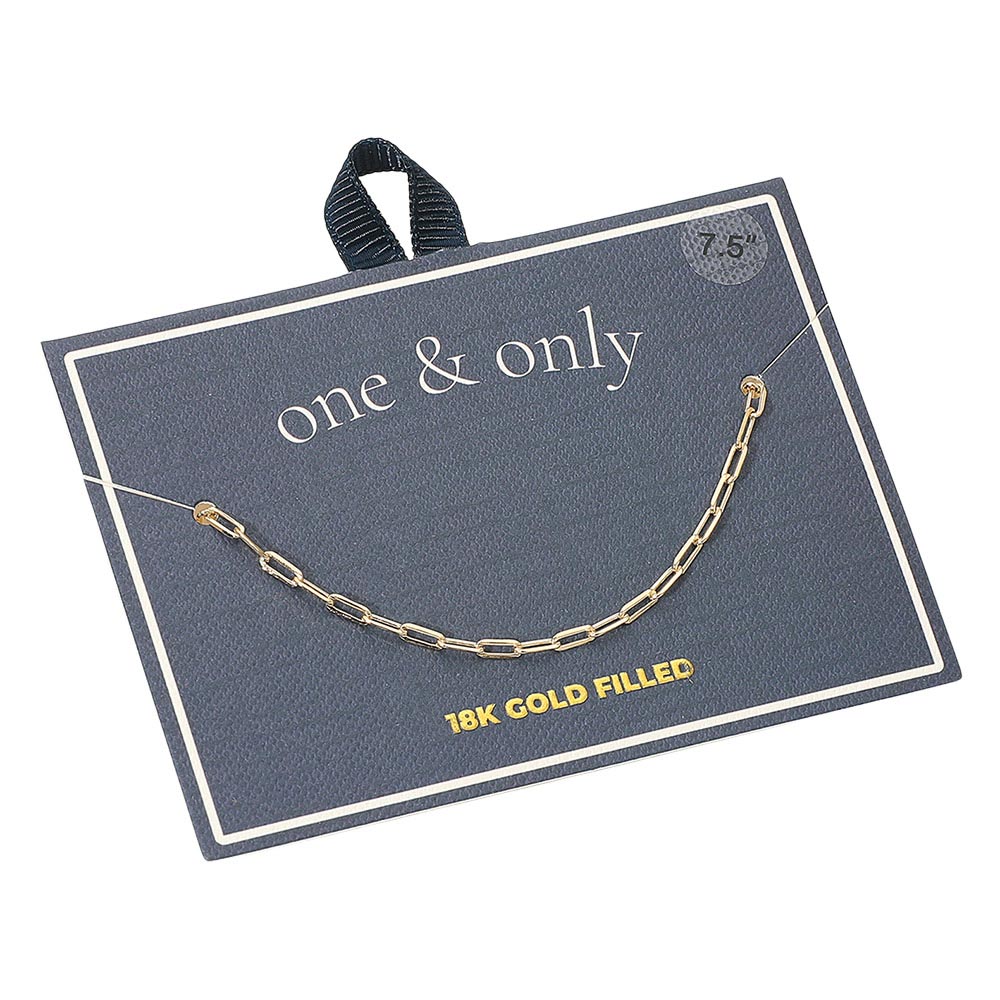 Details • Size : 0.1" H (3mm), 7.5" L • Elegant chain bracelet featuring a minimalist link design for timeless sophistication. Lightweight and versatile, it’s perfect for layering or wearing alone. Presented on a “one & only” card for effortless gifting and everyday elegance. • Lead and Nickel Compliant • Gold Filled • Made In Brazil