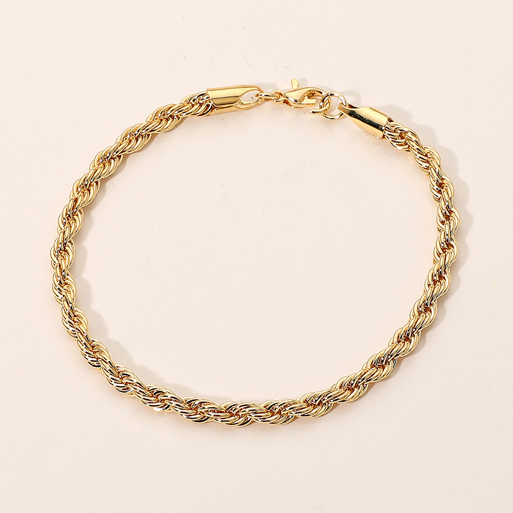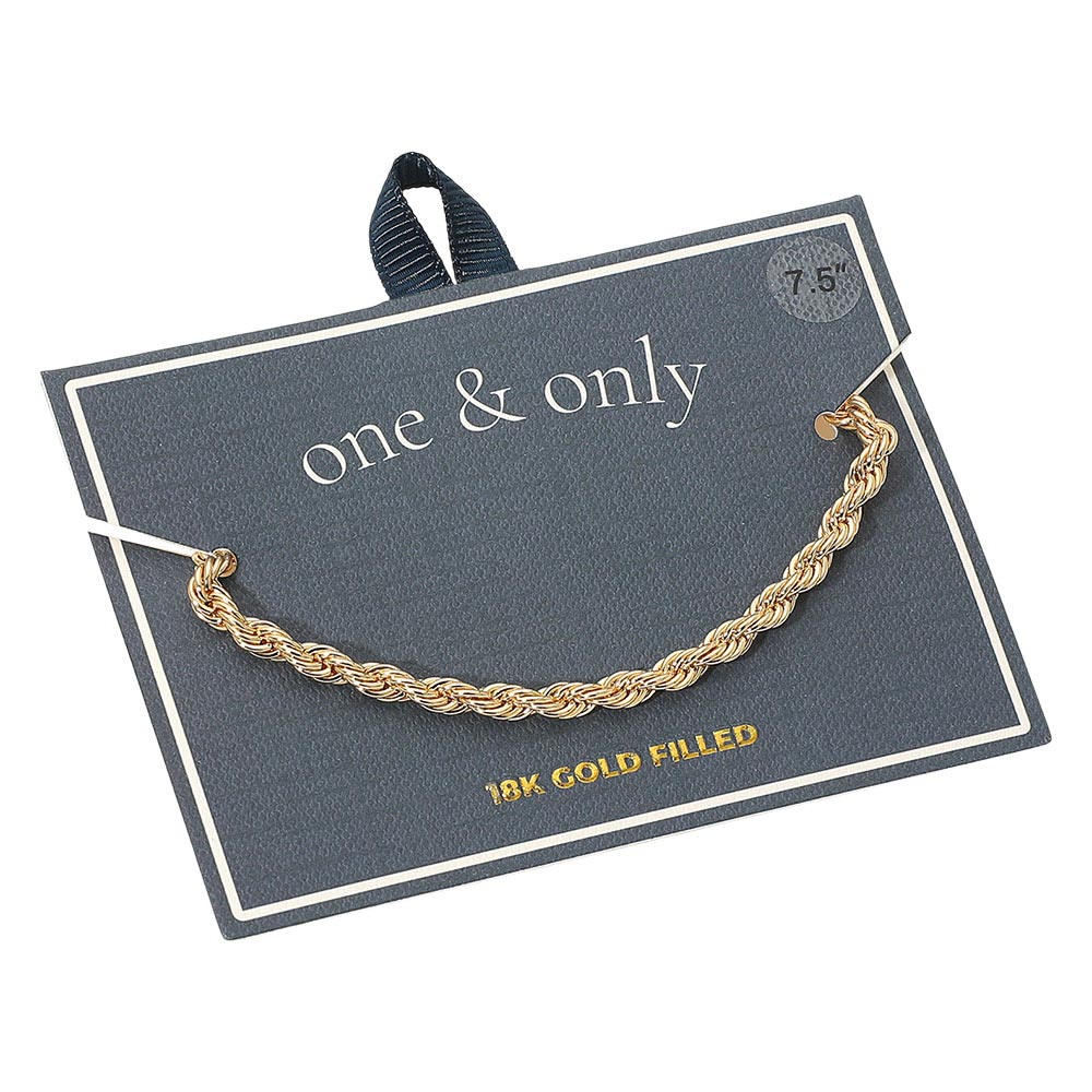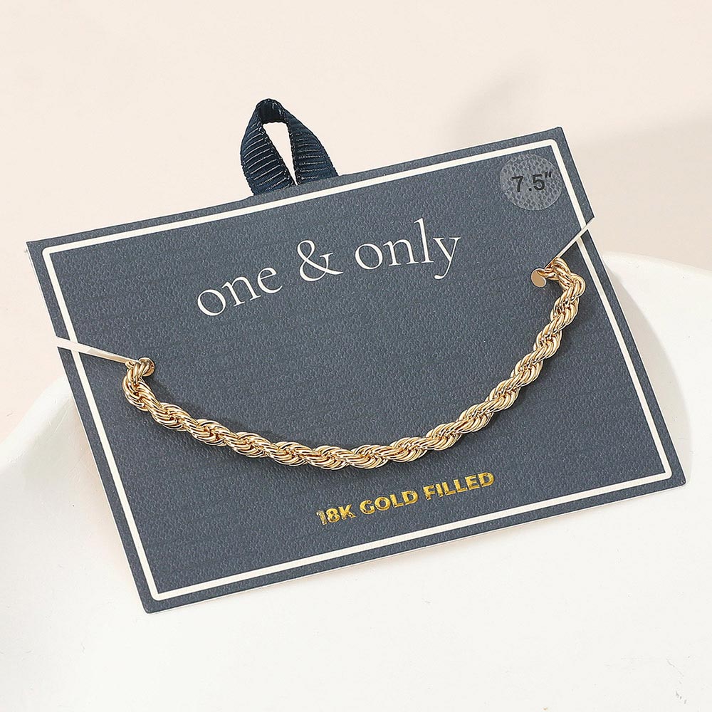 Details • Size : 0.2" H (4mm), 7.5" L • Lobster Clasp Closure • Refined rope chain bracelet showcasing a beautifully twisted pattern for a timeless look. Its intricate braided design adds sophistication and shine, perfect for layering or wearing solo. A chic, minimal accessory that elevates everyday or special occasion styles. • Lead and Nickel Compliant • Gold Filled • Made In Brazil