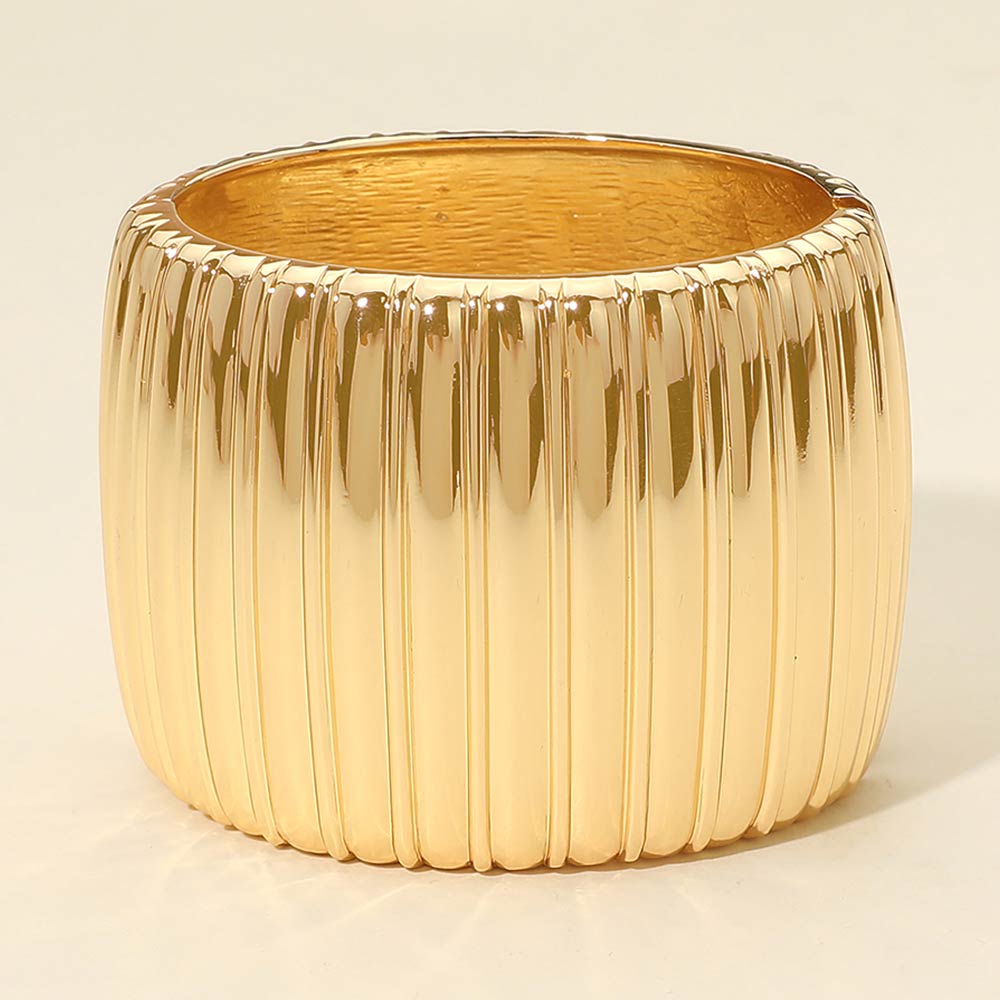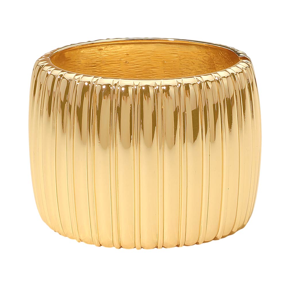 Details • Size : 2.25" H, 2.5" D • Hinged Closure • Bold statement band ring featuring a wide silhouette with ribbed texture for a structured, modern look. Designed to stand out worn solo or layered with other rings, this piece adds confident style and sculptural appeal to everyday outfits or elevated occasions. • Lead and Nickel Compliant
