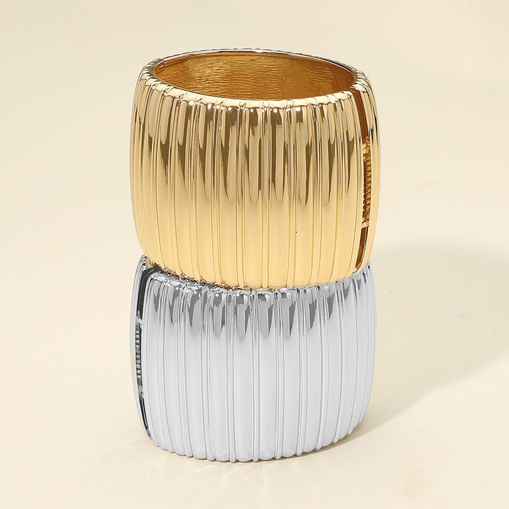 Details • Size : 2.25" H, 2.5" D • Hinged Closure • Bold statement band ring featuring a wide silhouette with ribbed texture for a structured, modern look. Designed to stand out worn solo or layered with other rings, this piece adds confident style and sculptural appeal to everyday outfits or elevated occasions. • Lead and Nickel Compliant