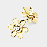 Stitched Faux Leather Layered Metal Floral Dangle Earrings