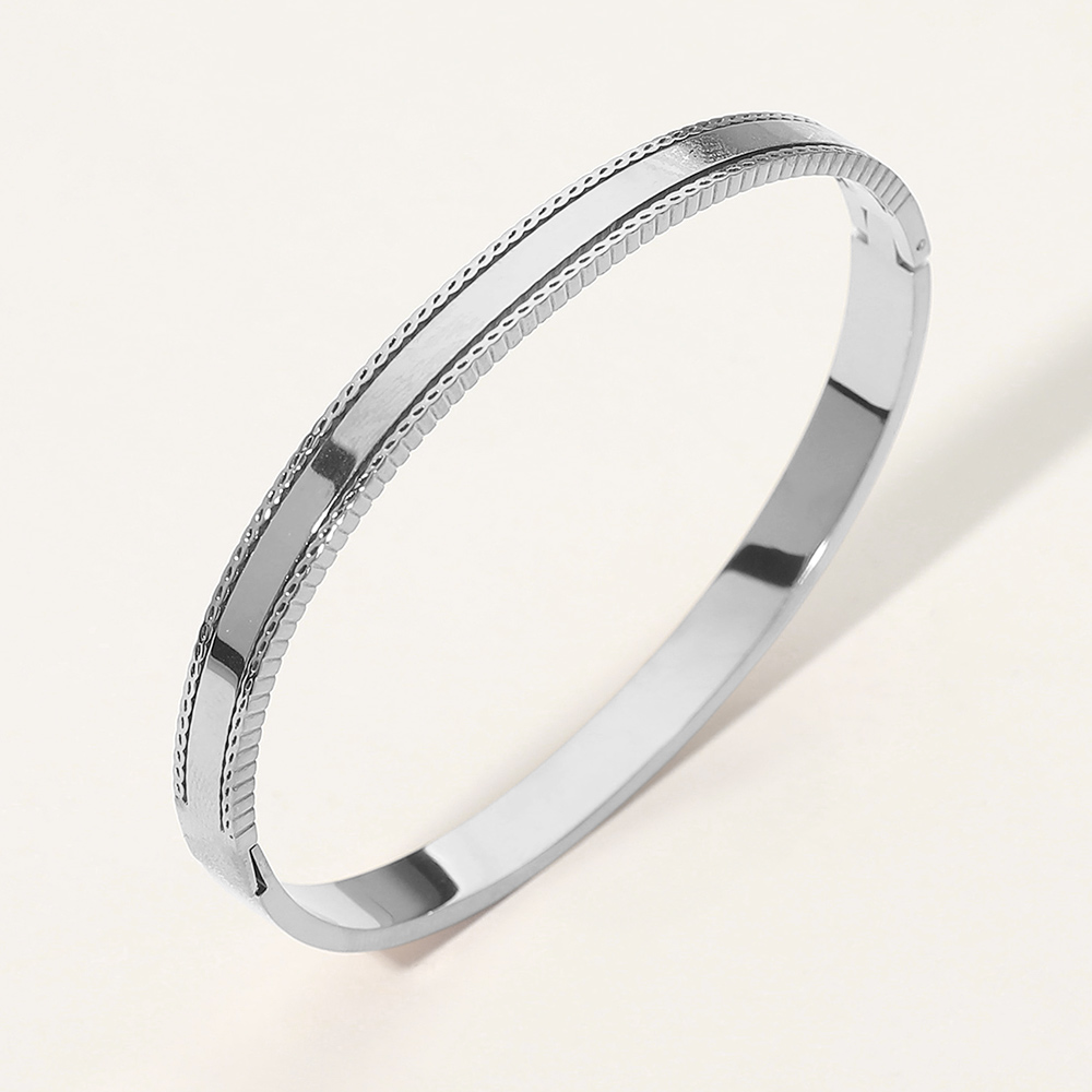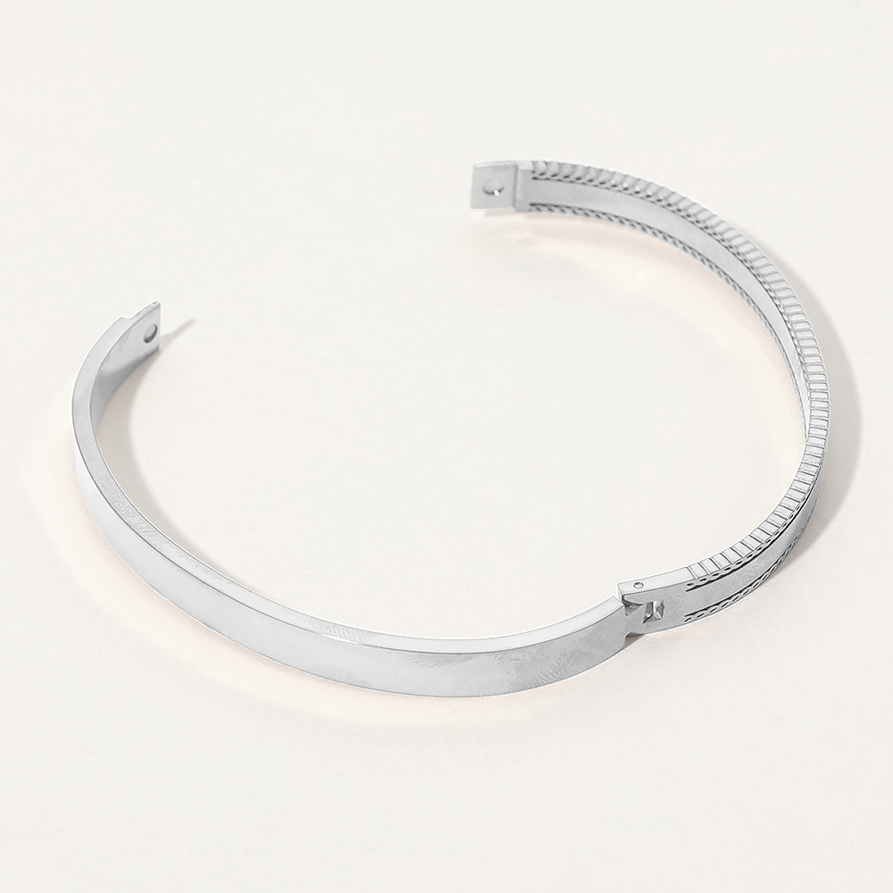• Sleek hinged bangle bracelet designed with a smooth polished surface and refined textured edge for subtle detail. Comfortable to wear and easy to style, it works beautifully alone or layered with other bracelets. Ideal for everyday wear, work outfits, gifting, and timeless accessory collections.