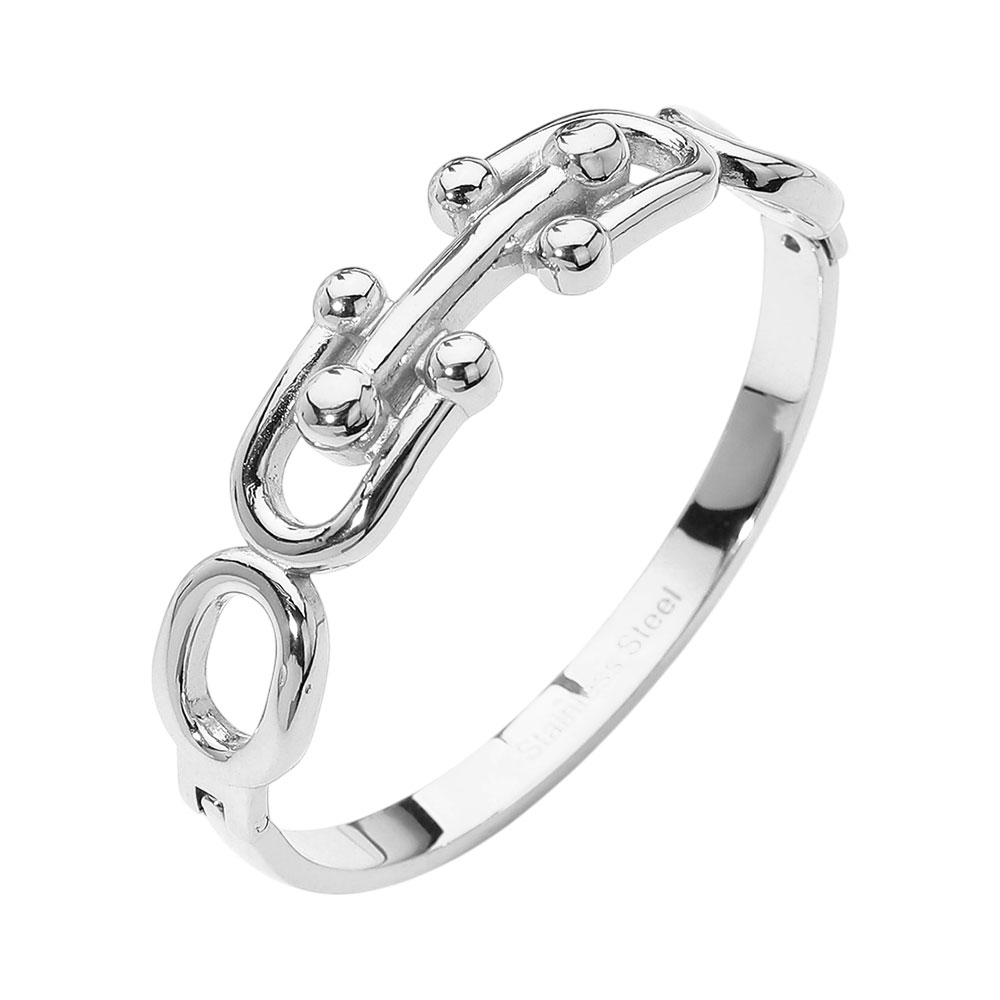 Details • Size : 0.7" H, 2.3" D • Hinged Closure • Bold hinged bracelet featuring sculpted chain link details with smooth rounded accents. Designed for easy on and off wear, this bracelet delivers a strong yet refined look that elevates everyday outfits. Ideal for stacking or wearing solo, it’s a versatile statement piece for modern accessory collections. • Stainless Steel