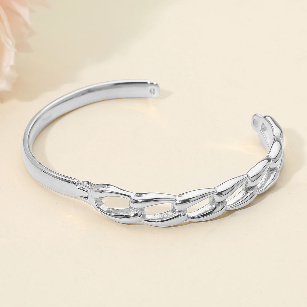 • Modern hinged bracelet designed with sleek chain-inspired detailing for a bold yet refined look. The hinged structure offers easy wear with a secure, comfortable fit, making it ideal for everyday styling or statement layering. A versatile accessory suited for boutiques, gift assortments, and trend-driven fashion collections.