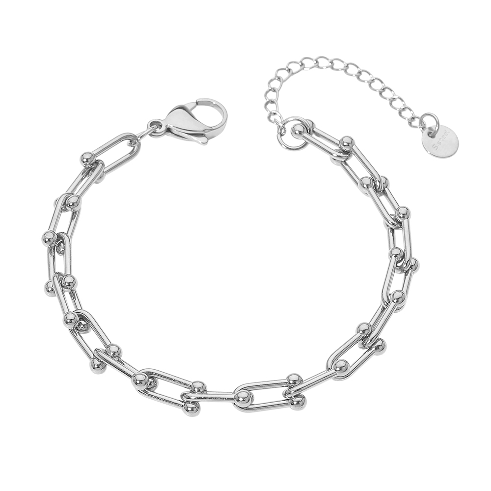 Details • Size : 0.25" H, 7.5" + 2.25" L • Lobster Clasp Closure • This stainless steel industrial link chain bracelet features a sleek, structured design accented with subtle rounded details for added dimension. Designed for everyday wear, it offers a refined statement that pairs effortlessly with casual or elevated looks. Perfect for stacking or wearing solo, it brings a clean, contemporary touch to any jewelry assortment. • Stainless Steel