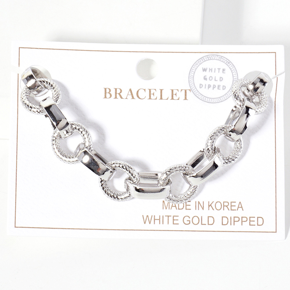 Details • Size : 0.4" H, 6.5" + 1.5" L • Lobster Clasp Closure • Make a striking impression with this bold interlocking link bracelet, crafted with a mix of smooth and textured finishes. Its elegant design adds dimension and style, making it a standout accessory for both casual and dressy occasions. Adjustable for a comfortable fit. • Lead and Nickel Compliant • Made In Korea • Gold Dipped