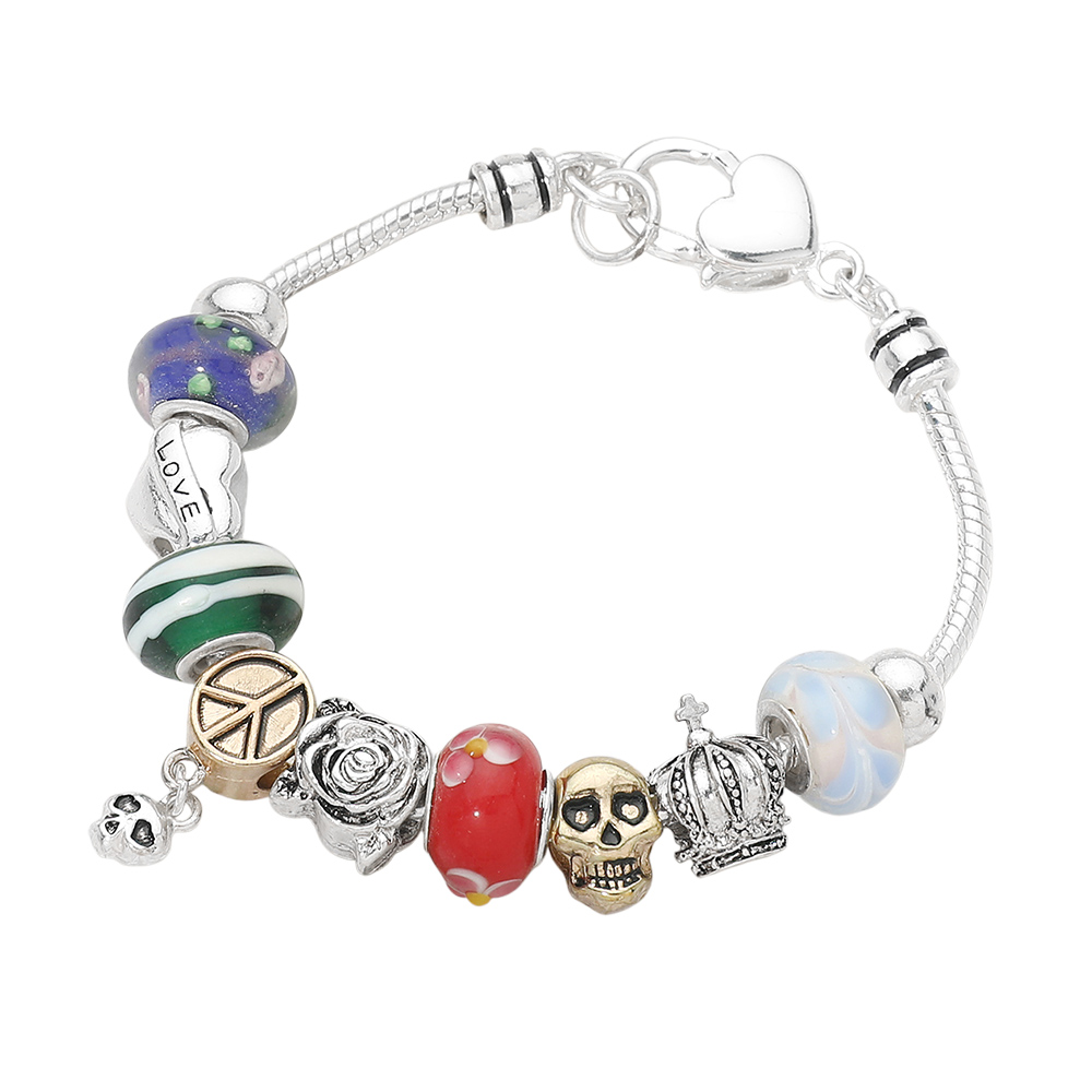 • Unique multi charm bracelet featuring symbolic motifs such as peace, love, crown, rose, and skull accents. Designed to express individuality and layered meaning, this statement accessory adds personality to everyday outfits and makes a thoughtful gift for trend focused customers.