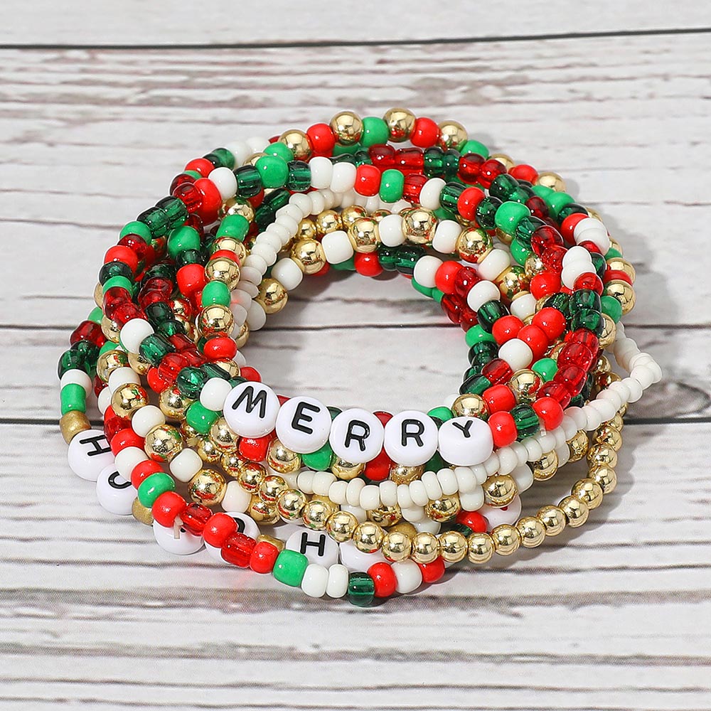 Details • Size : 1.75" H • Stretchable • Set of 10 holiday-inspired stretch bead bracelets with letter accents spelling festive words. Great for seasonal gifts, party favors, and Christmas displays. Easy to mix, match, and layer. • Lead and Nickel Compliant