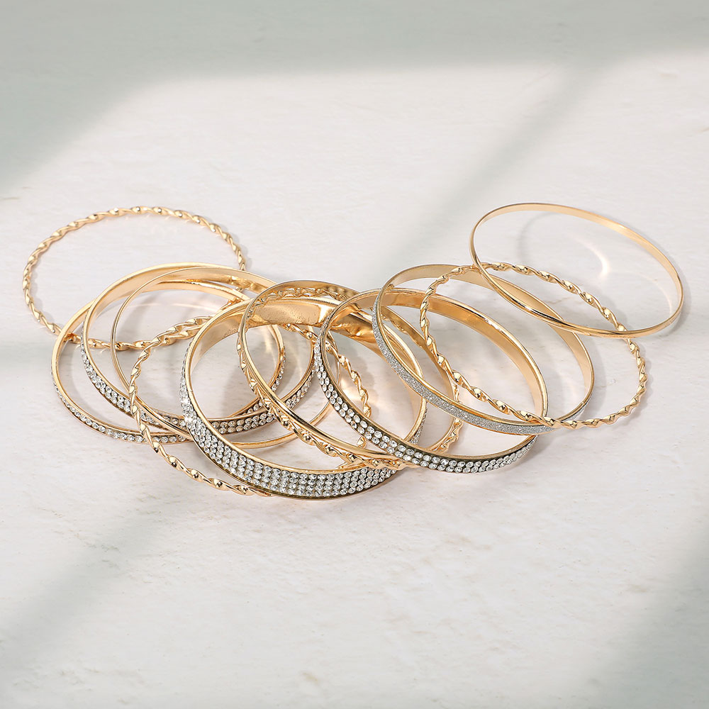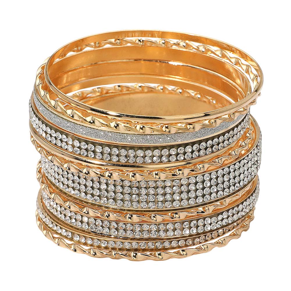 Details • Size : 1.5" H, 2.7" D • Make a bold statement with this Rhinestone Embellished Bangle Set, featuring a mix of textured and crystal-studded designs. Perfect for stacking or wearing individually, this set brings a touch of glamour and sophistication to any look, from casual wear to elegant occasions. • Lead and Nickel Compliant