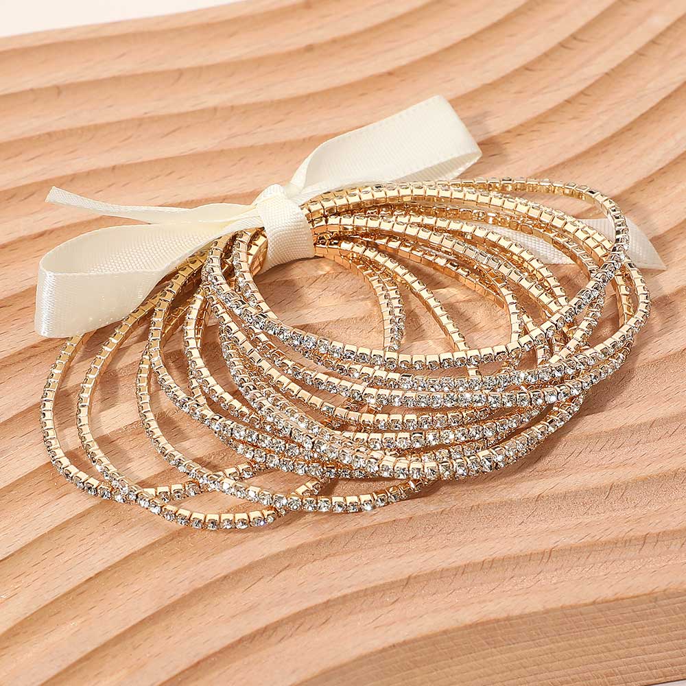 12PCS - Ribbon Slim Rhinestone Stretch Multi Layered Bracelet