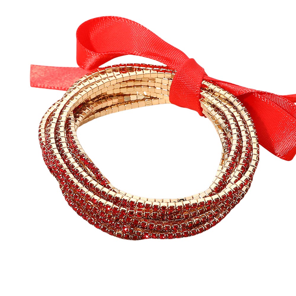 Details • Size : 1" H • Stretchable • Elegant layered stretch bracelet set featuring multiple slim bands tied together with a decorative ribbon. The stackable circular design adds texture and shine, perfect for both casual layering and festive occasions. • Lead and Nickel Compliant