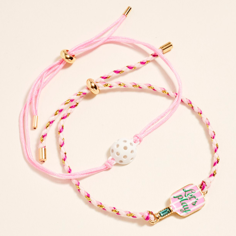 • This adjustable bracelet set features a playful pickleball theme with a sporty charm and coordinating cord design for everyday wear. Designed with flexible sizing for a comfortable fit, these bracelets are perfect for stacking, gifting, team events, or casual accessory collections celebrating an active and fun lifestyle.