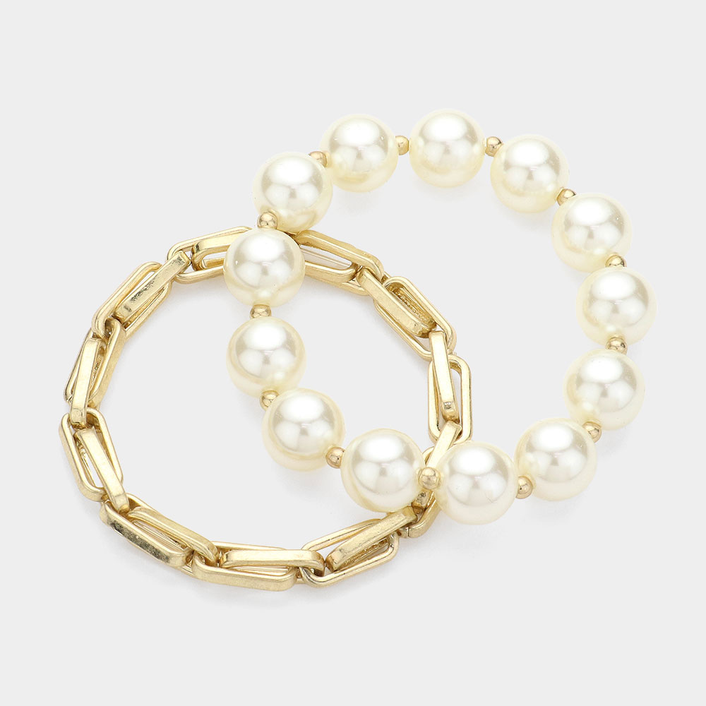 Details • Size : 0.8" H • Stretchable • Add timeless sophistication with this dual layer pearl and chain bracelet. Combining classic elegance with modern design, it features lustrous beads paired with a sleek link chain—perfect for elevating everyday style or adding a refined touch to evening wear. • Lead and Nickel Compliant
