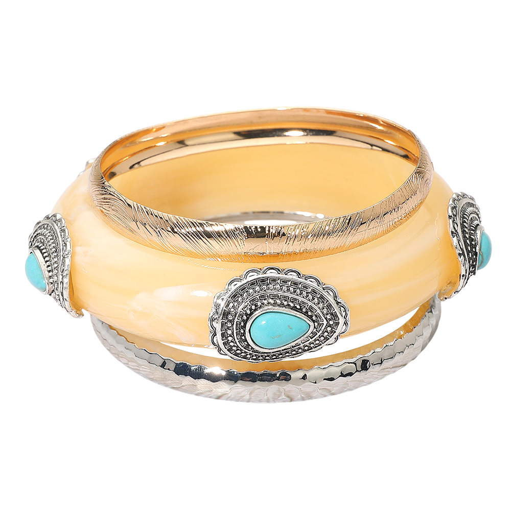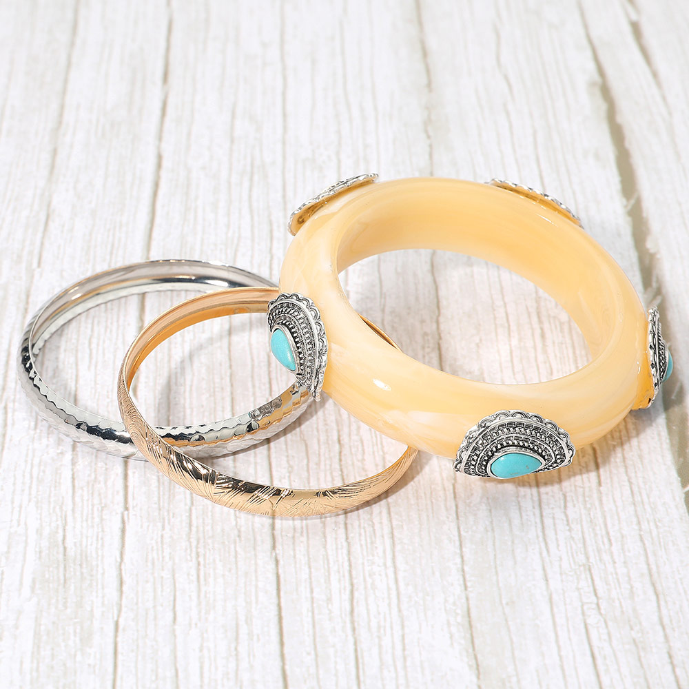 Details • Size : 1.5" H, 2.5" D • This three-piece bangle set blends smooth, sculpted shaping with ornate stone-accented details for a striking layered look. Each piece offers its own unique texture and design, creating a bold yet versatile accessory that enhances both casual and dressy outfits with effortless style. • Lead and Nickel Compliant