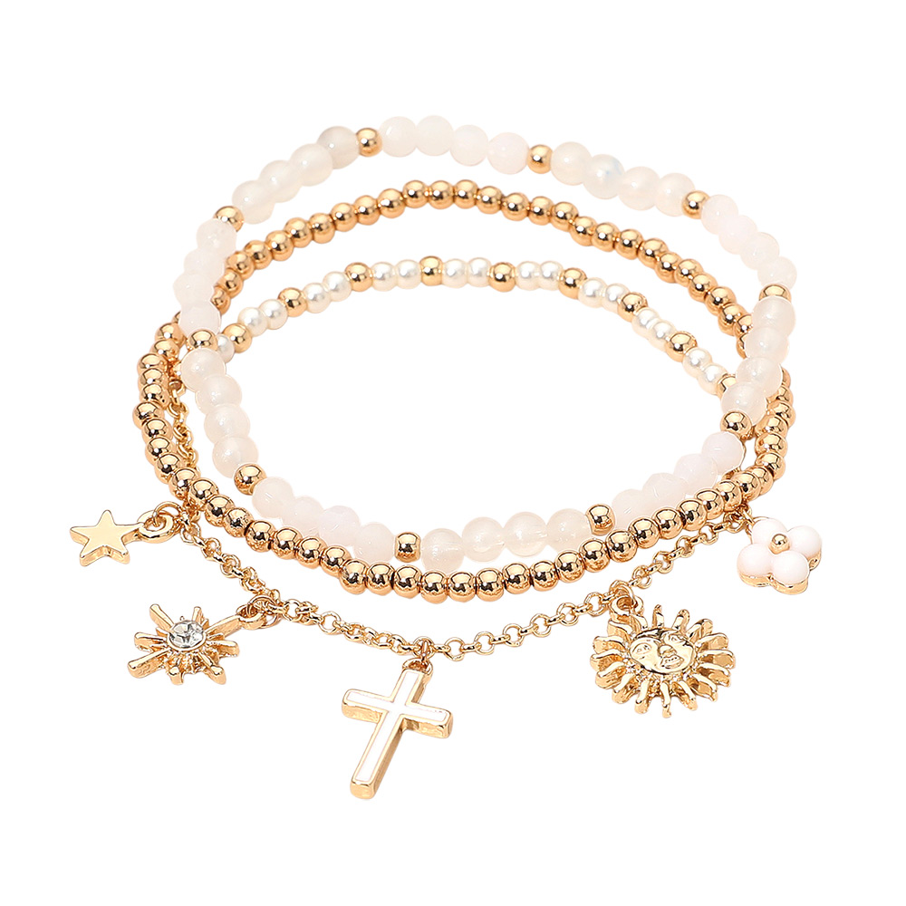 3PCS - Cross Flower Star Sunburst Charm Pearl Metal Ball Faceted Beaded Stretch Multi Layered Bracelets