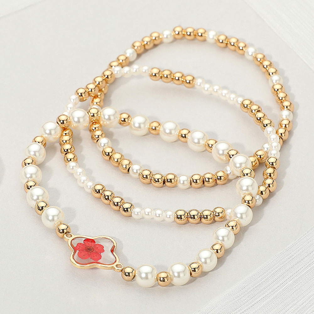 3PCS - Floral Accent Pearl Metal Ball Beaded Stretch Multi Layered Bracelets