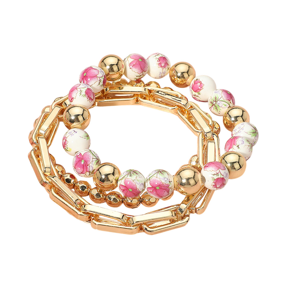 Details • Size : 1" H • Stretchable • Stylish 3 piece bracelet set featuring a mix of gold beads, chain links, and floral patterned beads. Designed for easy stacking or wearing solo, this versatile accessory adds a trendy layered touch, perfect for casual looks, special outings, or gifting someone with a fashionable jewelry accent. • Lead and Nickel Compliant