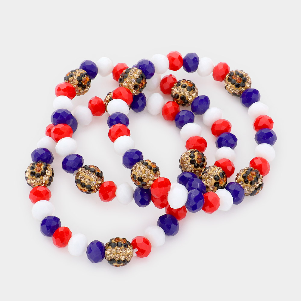 3PCS - Leopard Pattern American USA Flag Shamballa Ball Faceted Bead Stretch Bracelets