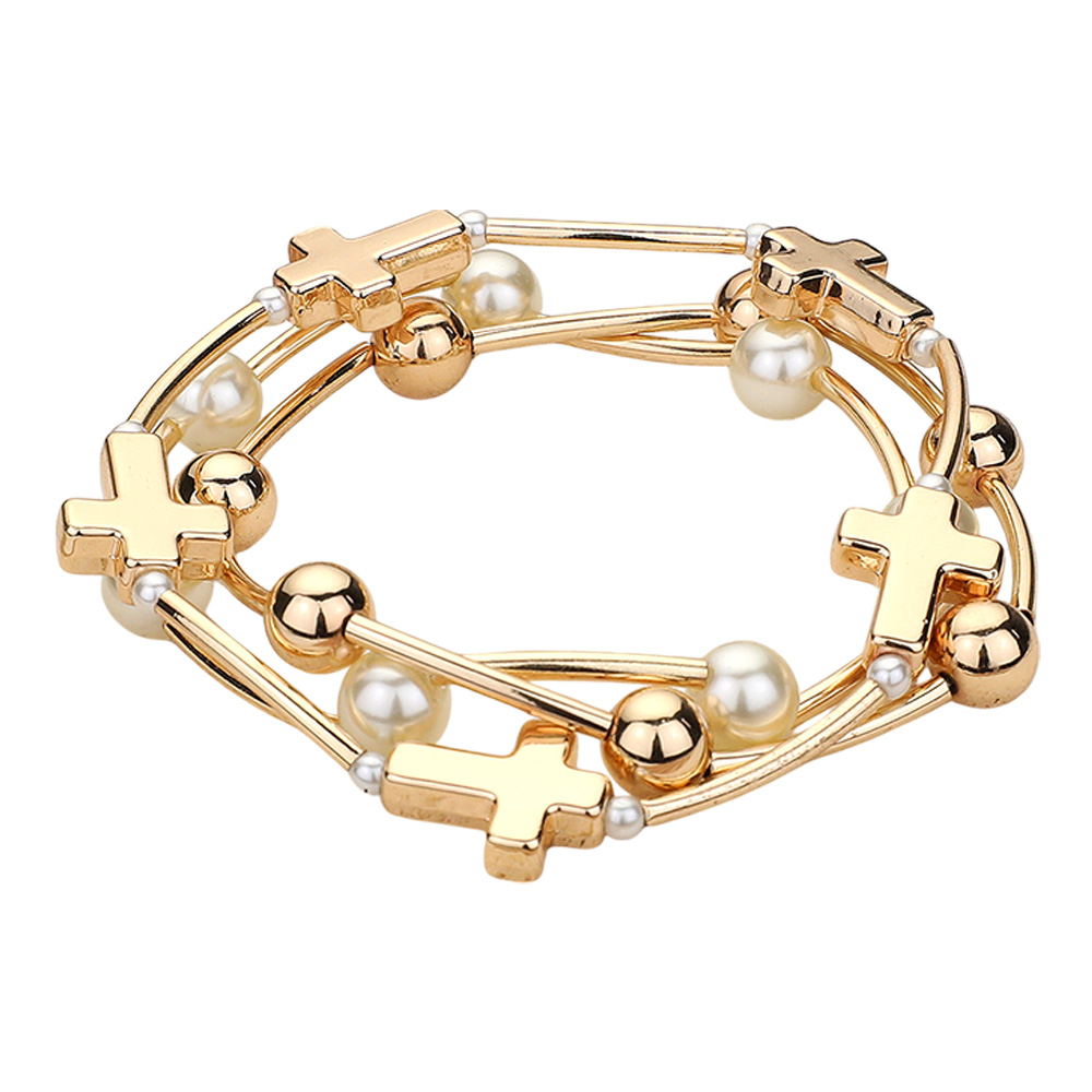 3PCS - Metal Cross Ball Pearl Station Stretch Multi Layered Bracelets